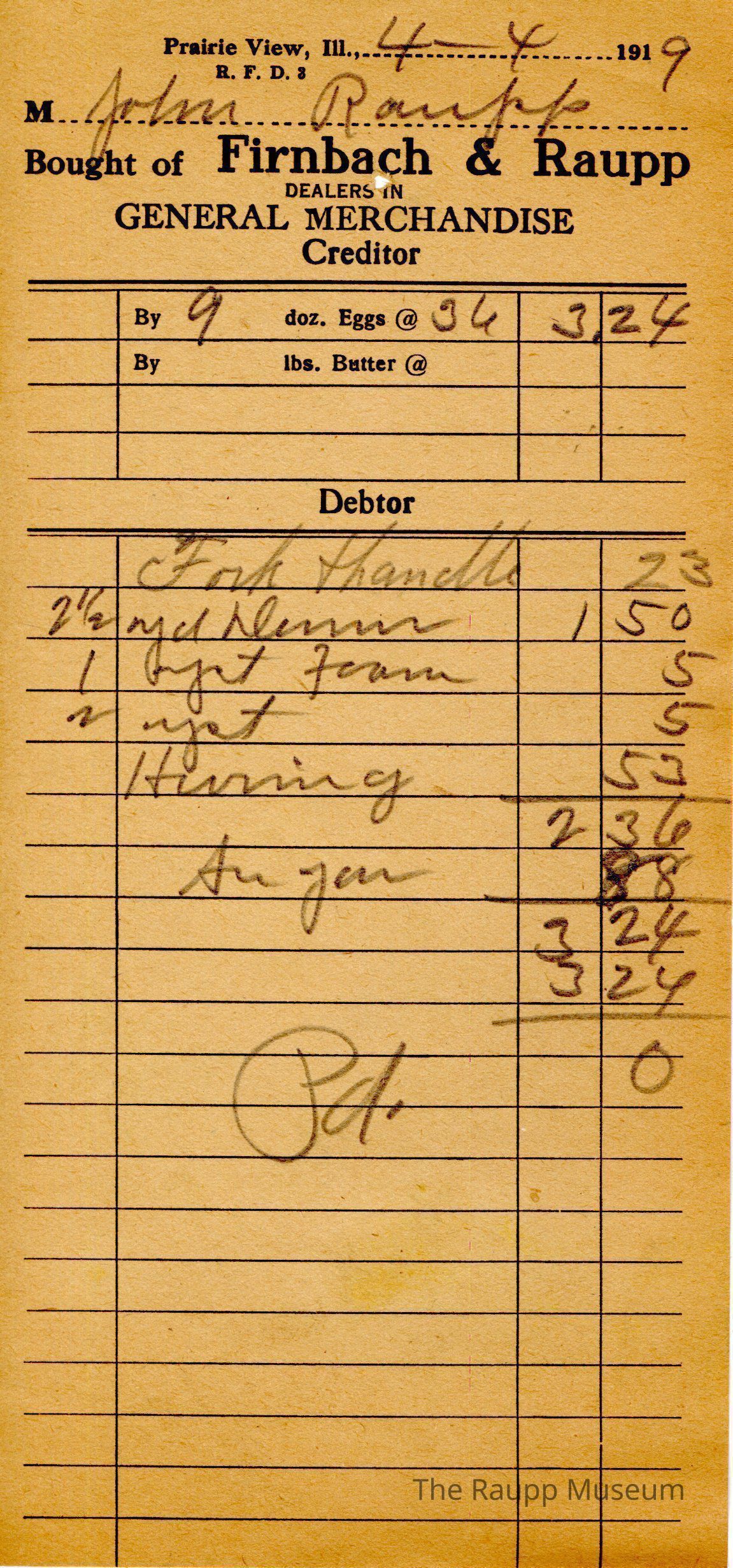 One (1) Firnbach and Raupp store receipt from Aril 4, 1919. Receipt is rectangular with black printed text and written notes in pencil. The receipt is for John Raupp, who sold 9 dozen eggs at $0.36 for $3.24. He bought a fork handle for $0.23, 2 1/2 yd denim for $1.50, 1 yst foam for $0.05, 2 yst for $0.05, herring for $0.53, and sugar for $0.88. Bill total was $3.24, which was subtracted from $3.24 for a total of $0.00. The bill is marked as paid.