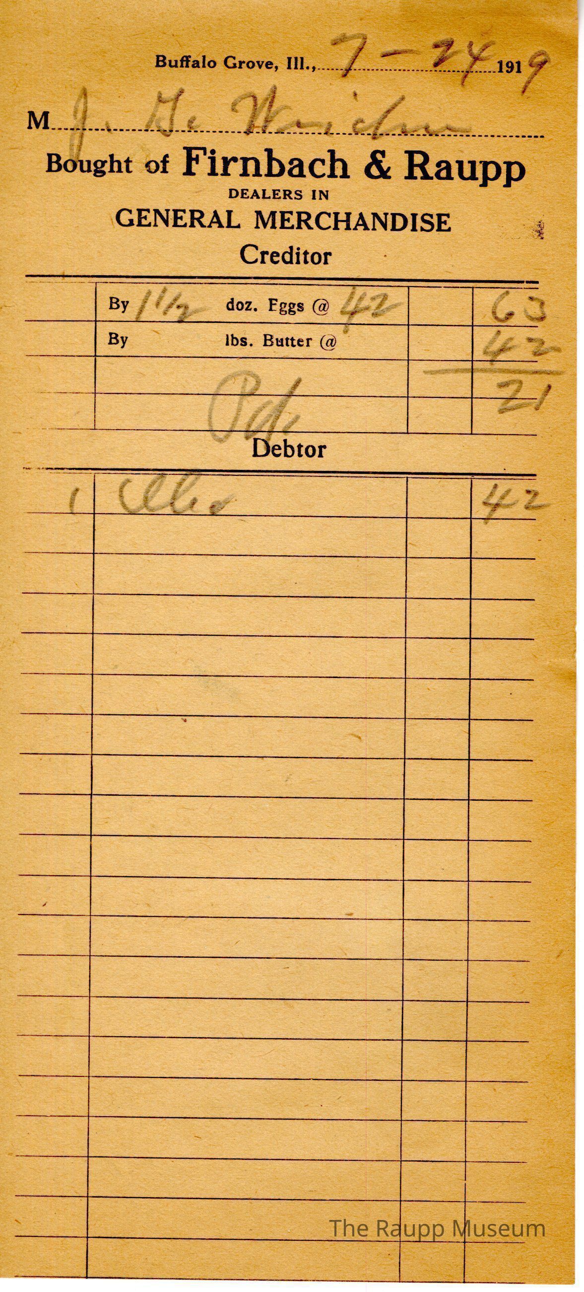 One (1) Firnbach and Raupp store receipt from July 24, 1919. Receipt is rectangular with black printed text and written notes in pencil. The receipt is for J.G. Weidner, who sold 1 1/2 dozen eggs @ $0.42 for a total of $0.63. They bought 1 Oleo for $0.42. After subtracting the spending total from the money earned from the eggs, the bill total was $0.21 earned. The bill is marked as paid.