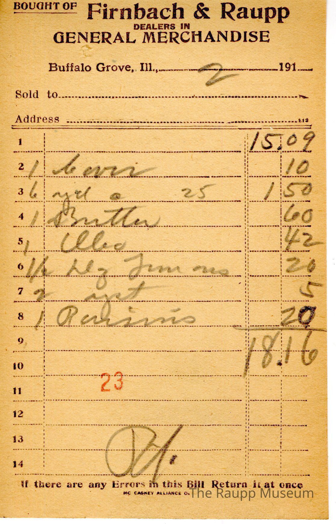 One (1) Firnbach and Raupp store receipt from circa 1919. Receipt is rectangular with black printed text and written notes in pencil.