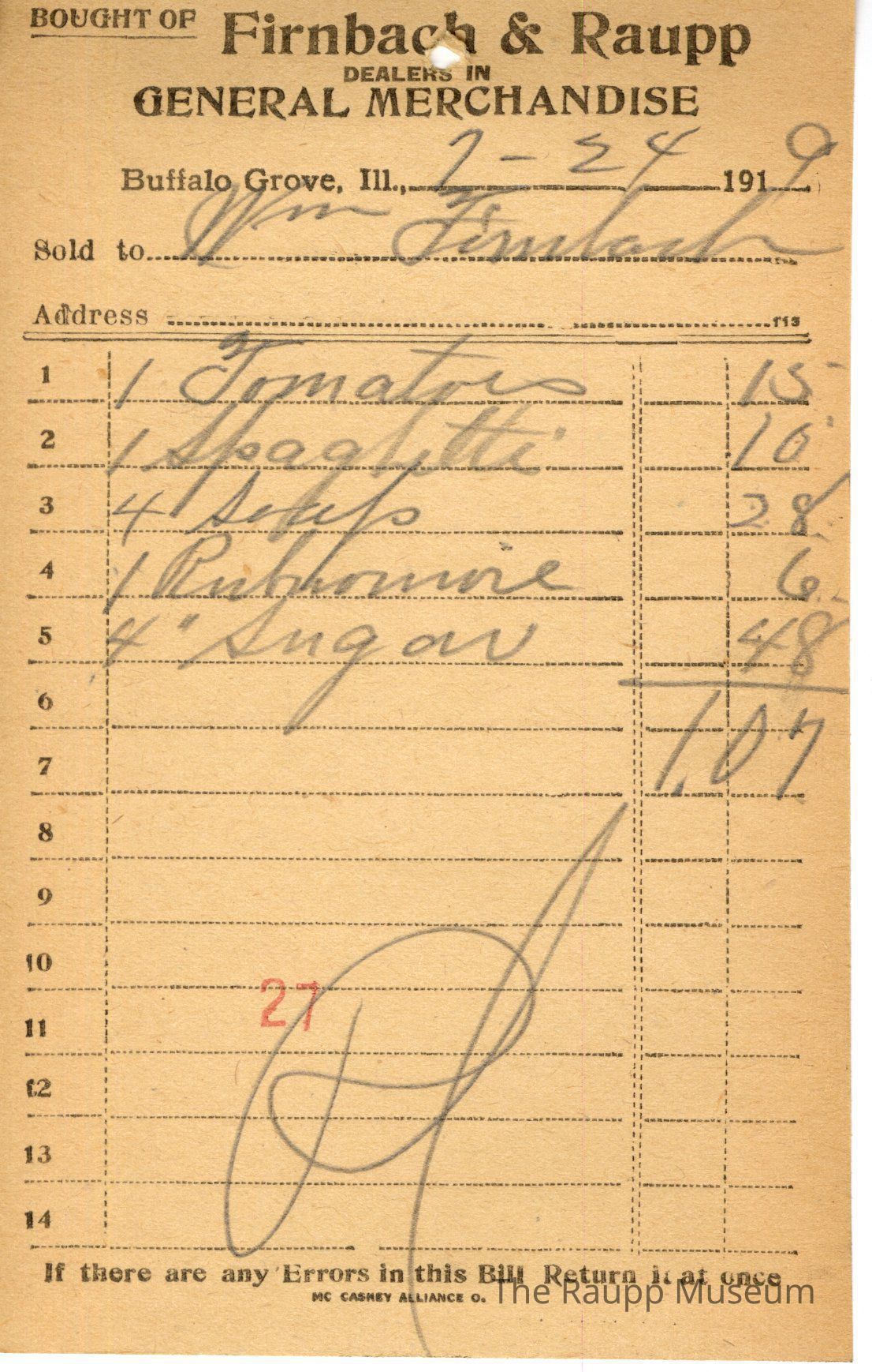 The black text is as follows, from top to bottom: Bought of Firnbach & Raupp; DEALERS IN; GENERAL MERCHANDISE; Buffalo Grove, Ill; Sold to; Address; If there are any Errors in this Bill, Return it at once; Mc Caskey Alliance CoArchive Details