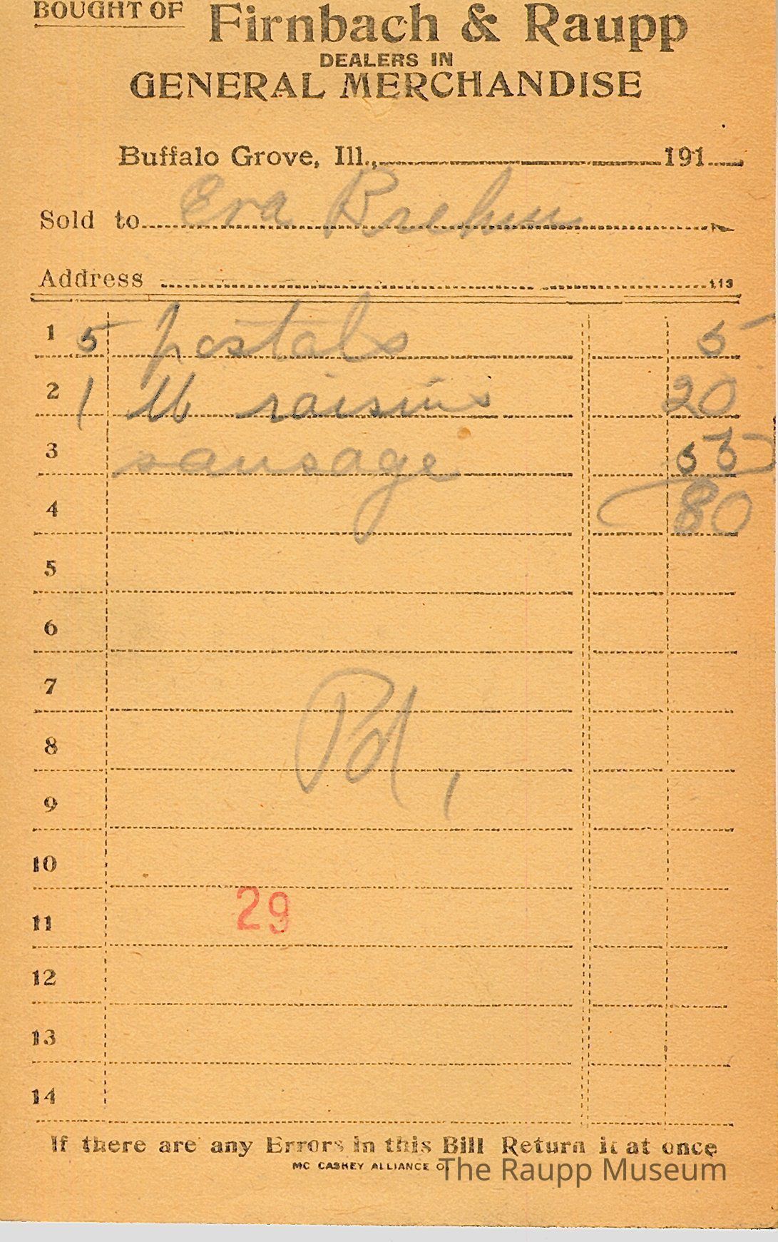 The black text is as follows, from top to bottom: Bought of Firnbach & Raupp; DEALERS IN; GENERAL MERCHANDISE; Buffalo Grove, Ill; Sold to; Address; If there are any Errors in this Bill, Return it at once; Mc Caskey Alliance CoArchive Details
