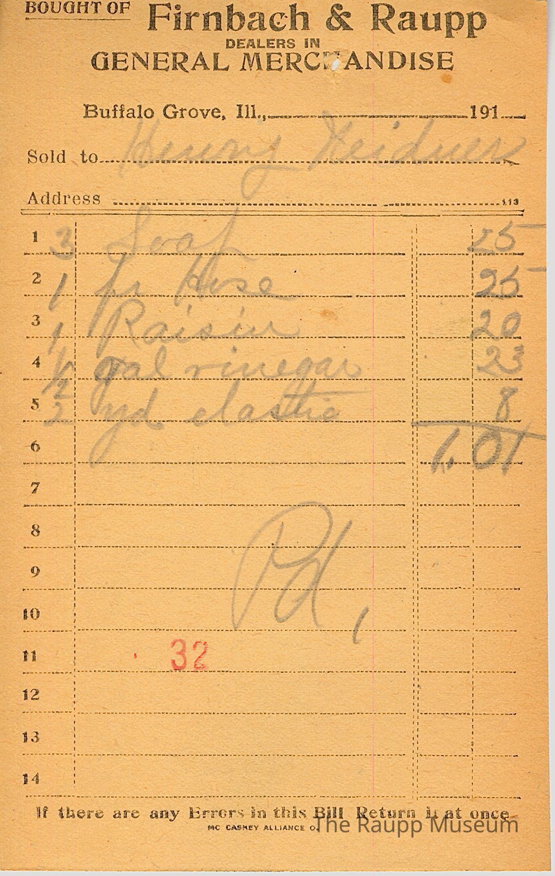 The black text is as follows, from top to bottom: Bought of Firnbach & Raupp; DEALERS IN; GENERAL MERCHANDISE; Buffalo Grove, Ill; Sold to; Address; If there are any Errors in this Bill, Return it at once; Mc Caskey Alliance CoArchive Details