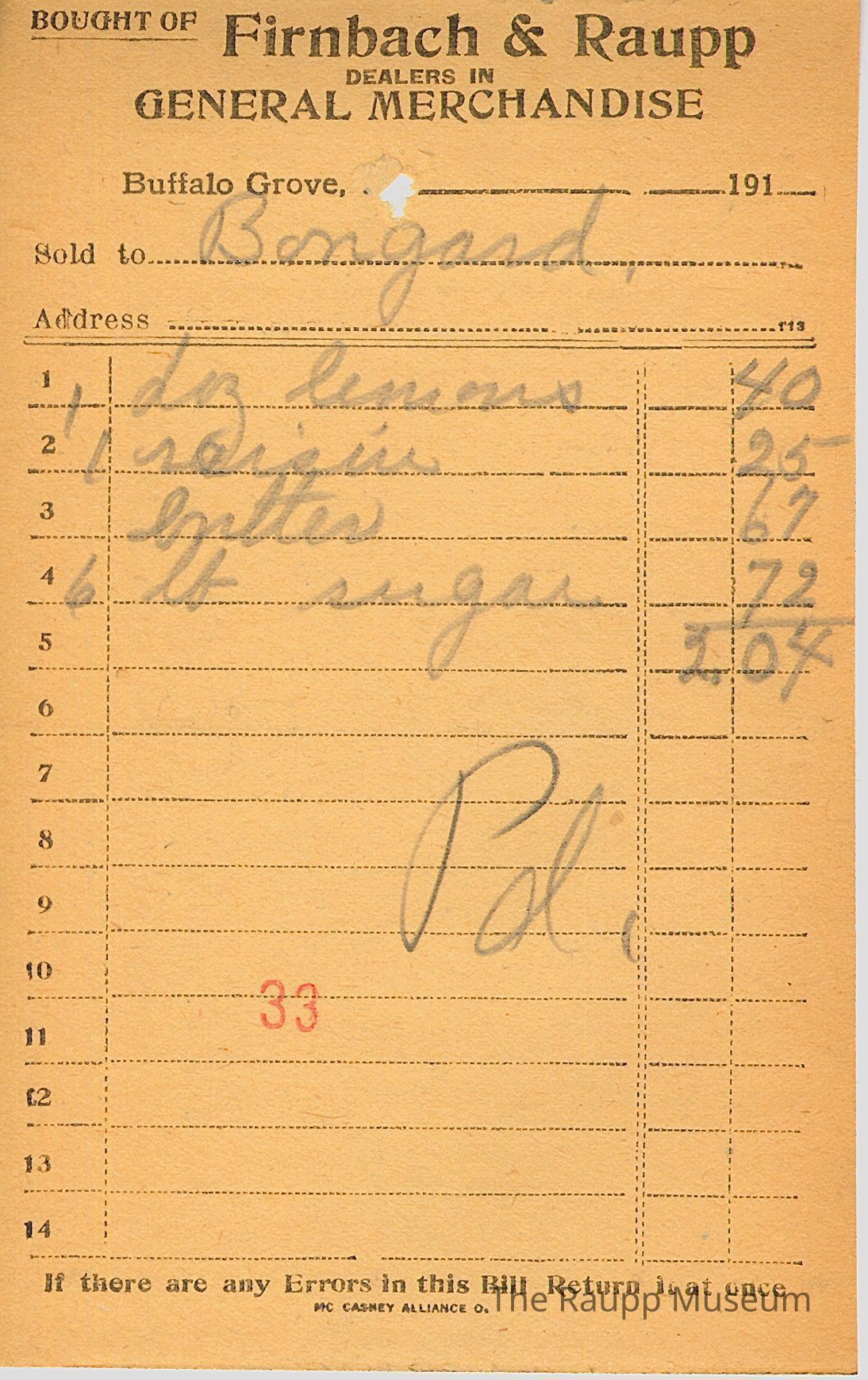 The black text is as follows, from top to bottom: Bought of Firnbach & Raupp; DEALERS IN; GENERAL MERCHANDISE; Buffalo Grove, Ill; Sold to; Address; If there are any Errors in this Bill, Return it at once; Mc Caskey Alliance CoArchive Details