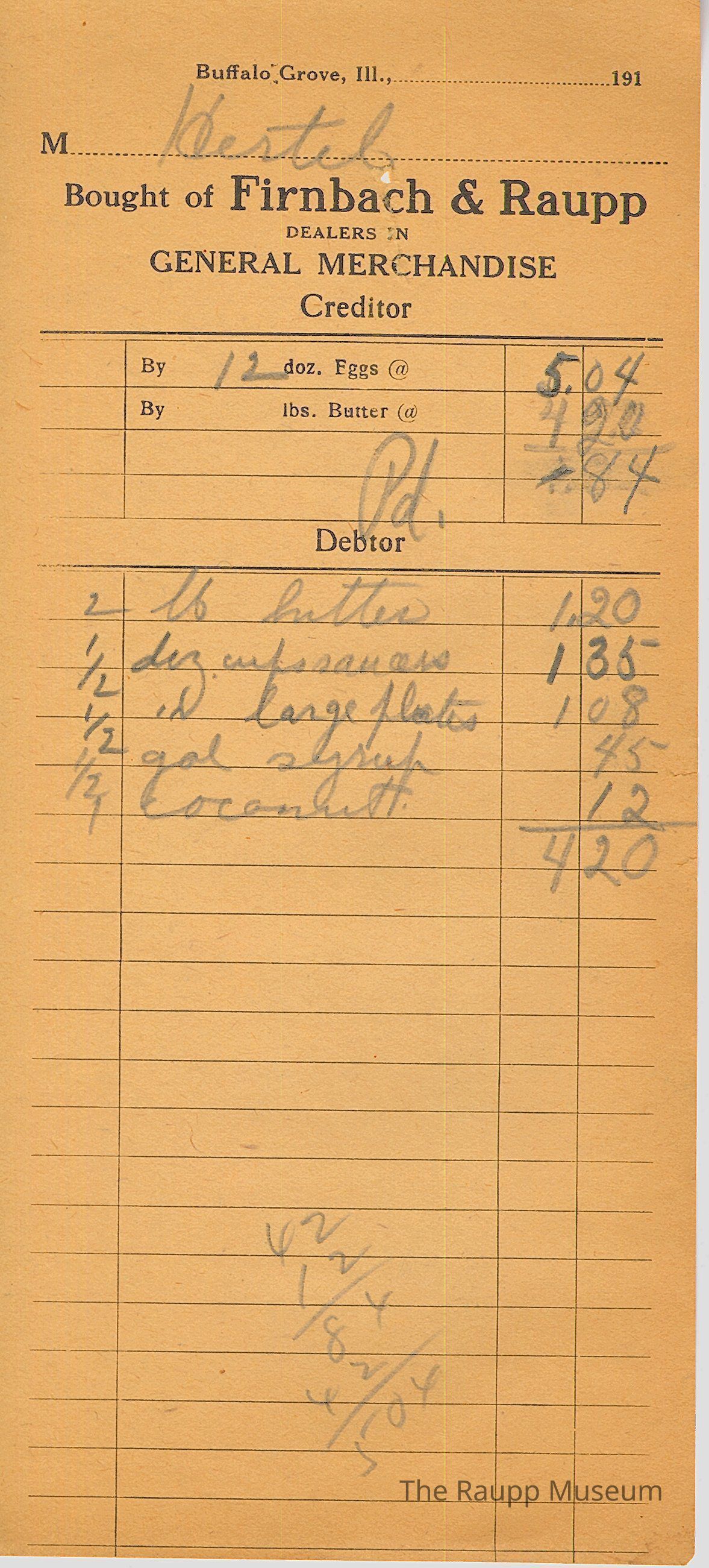One (1) Firnbach and Raupp store receipt from circa 1919. Receipt is rectangular with black printed text and written notes in pencil. The receipt is for Hertel who sold 12 dozen eggs for $5.04. They bought 2 lb butter for $1.20, 1/2 dz cup saucers for $1.35, 1/2 dz large plates(?) for $1.08, 1/2 gal syrup for $0.45 and 1 coconut for $0.12. The spending total was $4.20. After subtracting the spending total from the money earned from the eggs, the bill total was $0.84 earned. The bill is marked as paid. There is multiplication at the bottom of the receipt.