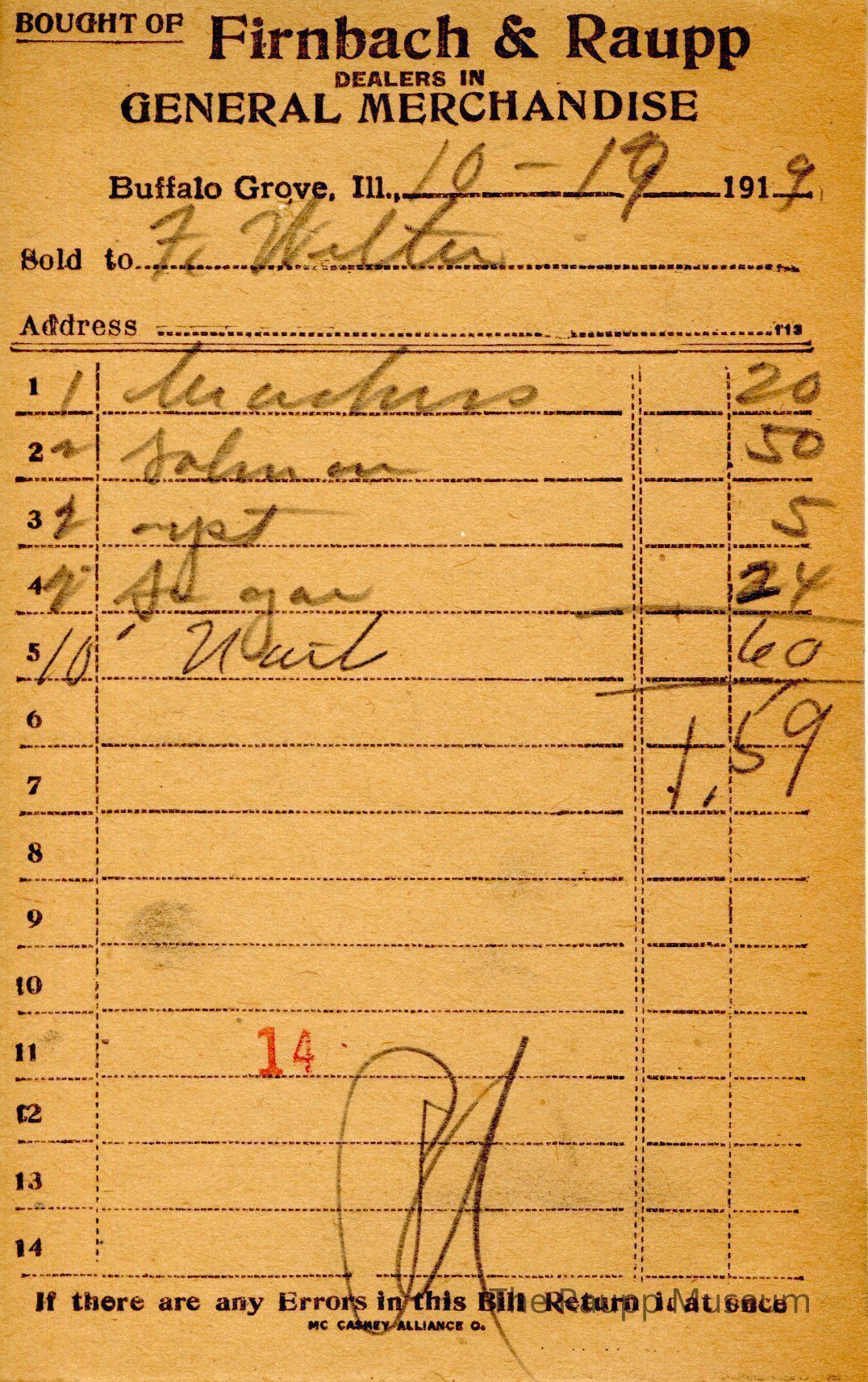 One (1) Firnbach and Raupp store receipt from October 17, 1919. Receipt is rectangular with black printed text and written notes in pencil. The receipt is for F. Welter, who bought one crackers for $0.20, two salmon for $0.50, two yeast for $0.05, two pounds of sugar for $0.24, and ten penny nails for $0.60. The total is $1.59. A red stamp of 14 is located towards the bottom of the page and the receipt is marked as paid. The text from top to bottom is: BOUGHT OF Firnbach & Raupp; DEALERS IN GENERAL MERCHANDISE; Buffalo Grove, Ill.; Sold to; Address; If there are any Errors in this Bill Return It at once; MC CASKEY ALLIANCE O.Archive Details