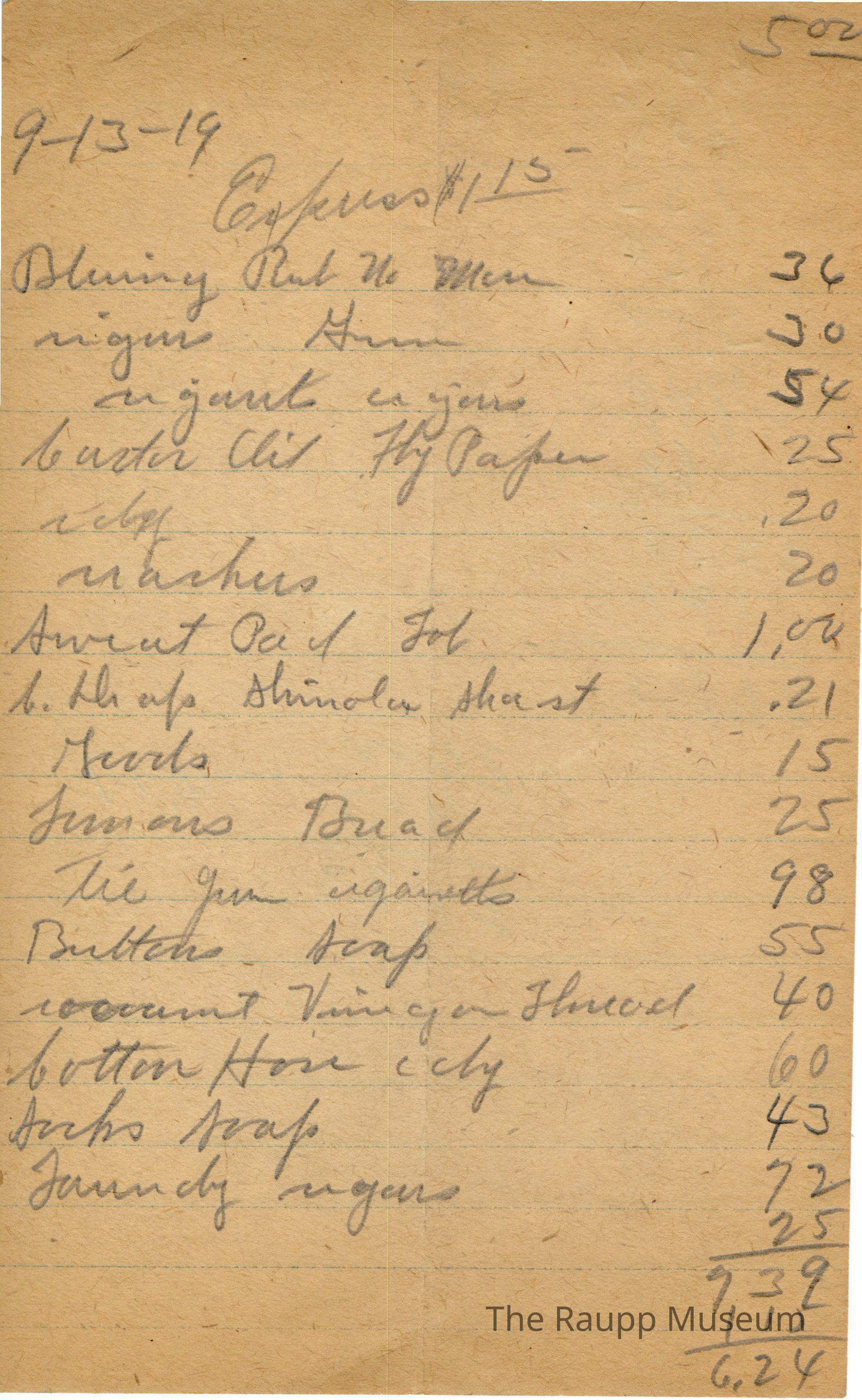 One (1) Firnbach and Raupp store receipt from September 13, 1919. Receipt is rectangular with no printed text and written notes in pencil. The receipt is for an unknown customer, who bought express for $1.15, Blueing Rub No More for $0.36, cigar Garm (?) for $0.30, cugant cigars (?) for $0.54, Carter Oil Fly Paper for $0.25, e chy (?) for $0.20, marchees (?) for $0.20, Sweat Pad Tub for $1.00, l. whap Shinola Shast (?) for $0.21, sevets (?) for $0.15, Femans bread (?) for $0.25, Tre Yum cigaretts (?) for $0.98, butter soap for $0.55, coconut vinegar thread for $0.40, butter hose echy (?) for $0.60, sucho soap (?) for $0.43, and hamm dz cigars for $0.72. Upon subtracting $1.15, the bill total appears to be $6.24. There are additional prices of $5.00 and $0.25 on the receipt.Archive Details