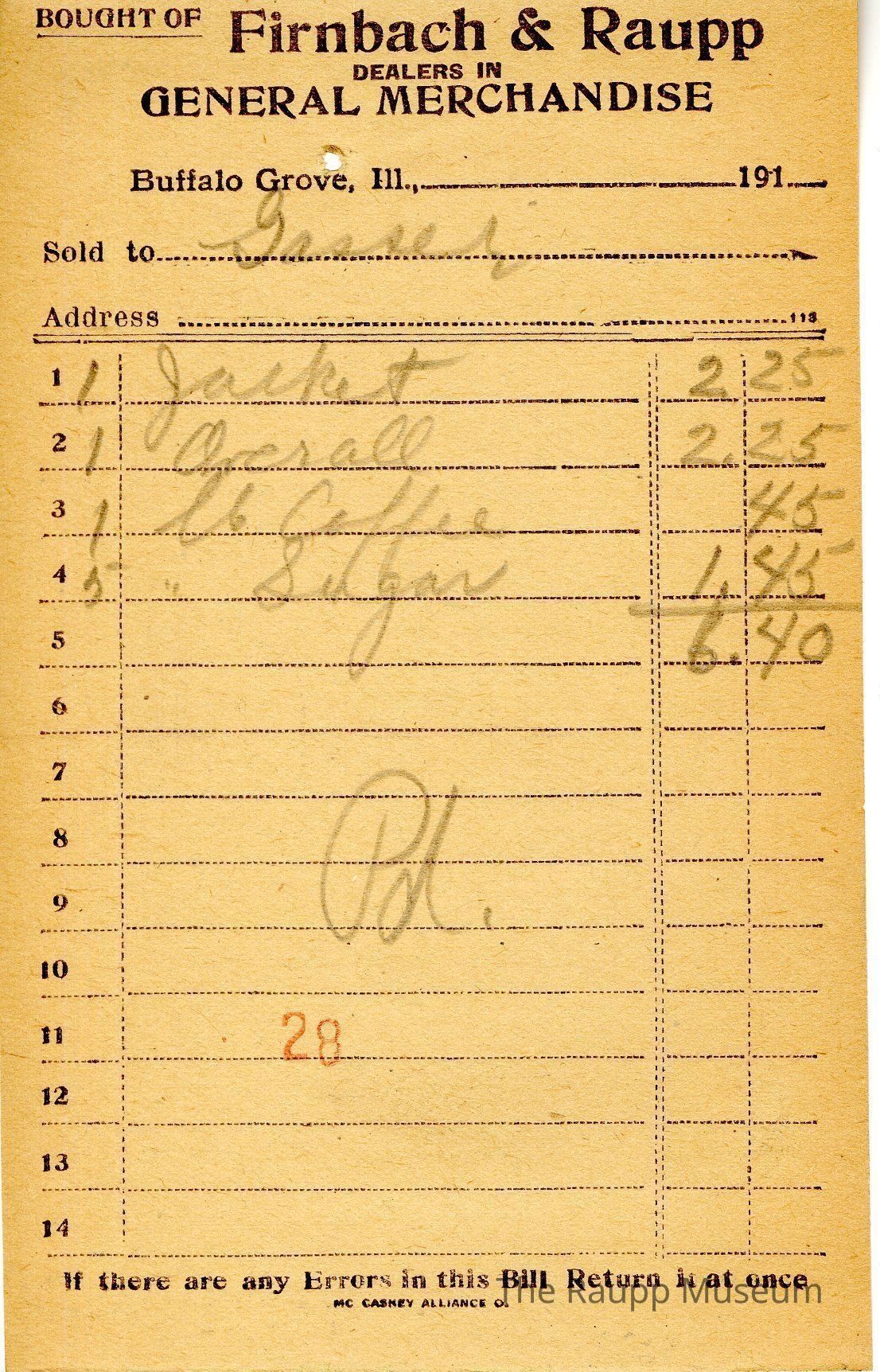 The black text is as follows, from top to bottom bought of Firnback & Raupp; Dealers in General Merchandise; Buffalo Grove, Ill.; Sold to; Address; If there are any Errors in this Bill Return it at once; MC CASKEY ALLIANCE O.Archive Details