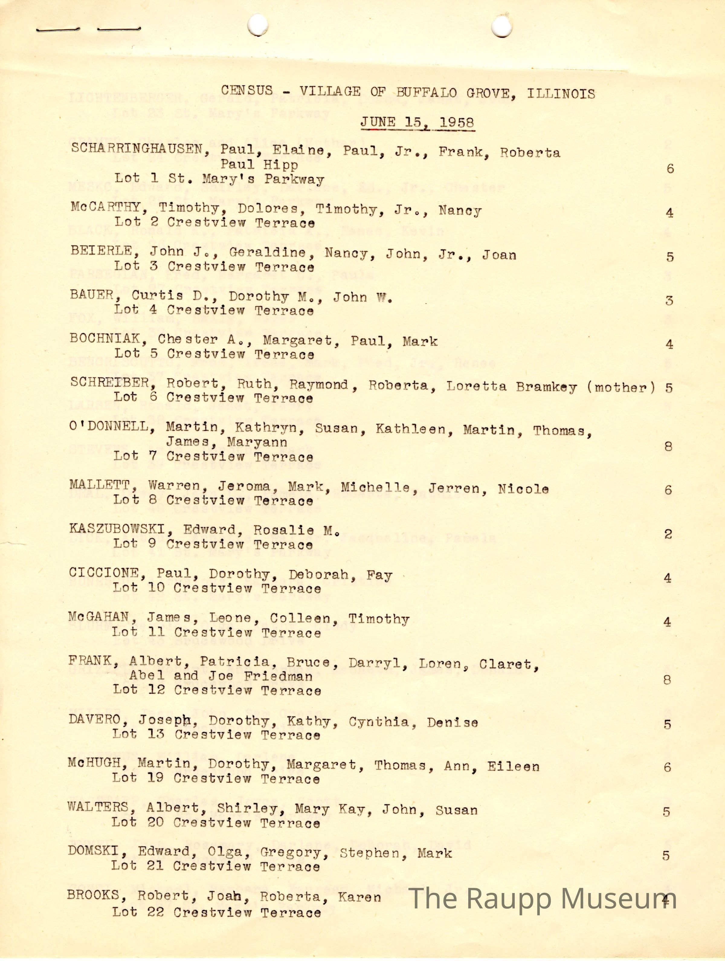 One (1) Village of Buffalo Grove, Illinois Census record from June 15th, 1958. Individuals names, and where they live is recorded. Overall 164 individuals recorded. There are four sheets. Ther first three document the villages residents and the last sheet is a sowrn statement of accurary by the census taker, Leone C. McGaham and Village Clerk, Paula Clohesey.Archive Details