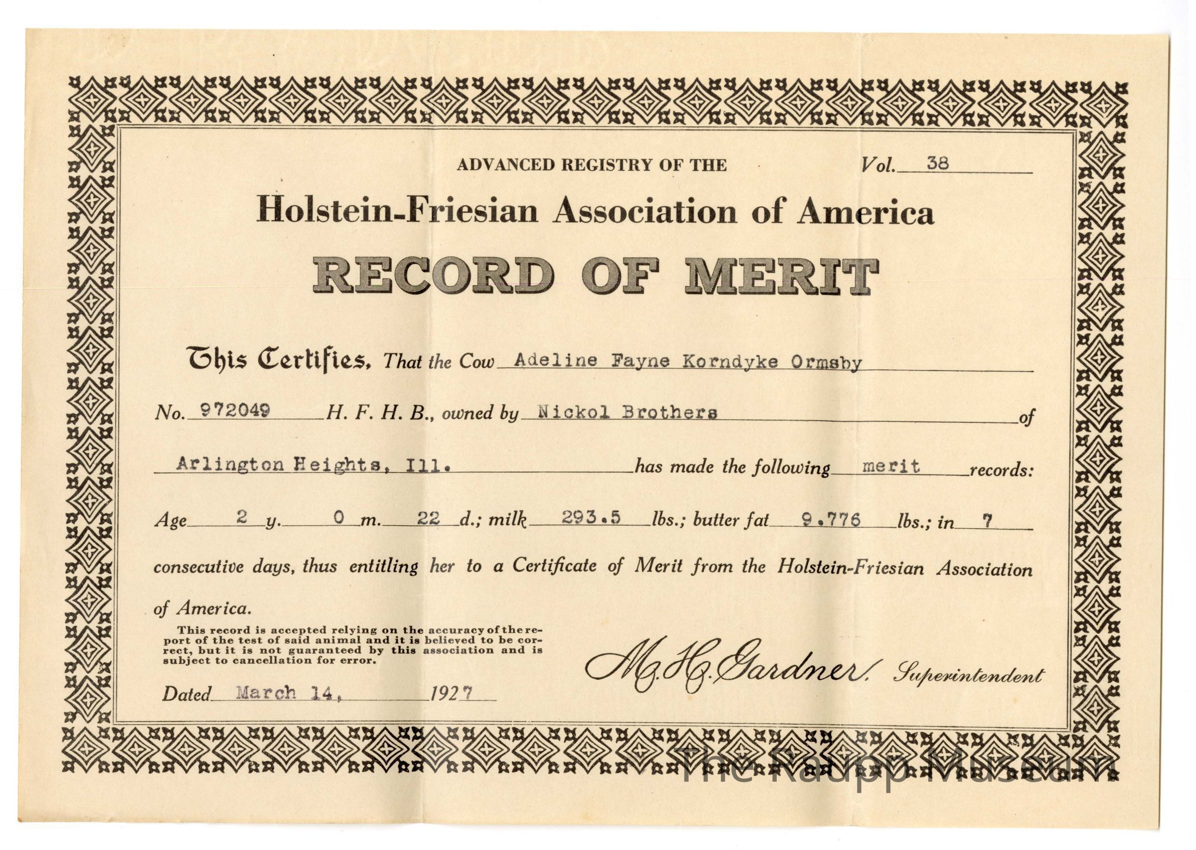 One (1) brown rectangular certificate for Advanced Registry of the Holstein Friesian Association of American Record of Merit. Certificate has decorative repeating black border that certifies Adeline Fayne Korndyke Ornsby (owned by J.S. Nickol) produced 293.5 lbs of milk, 9.776 lbs butter fat in 7 days. Certificate dated 03/14/1927.