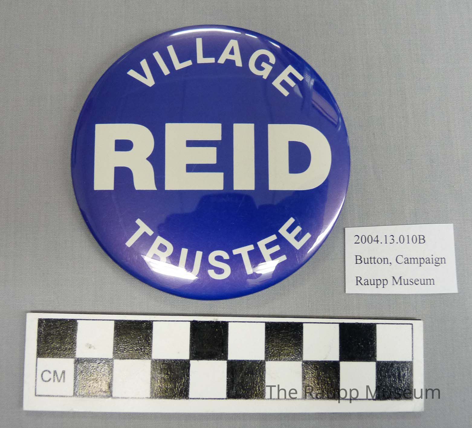 One (1) round metal campaign button with a blue background and white text: "Village Trustee Reid". Along the side is printed: "Jansco Inc, Chicago IL 60630".The back is silver with a safety pin attachment.Material