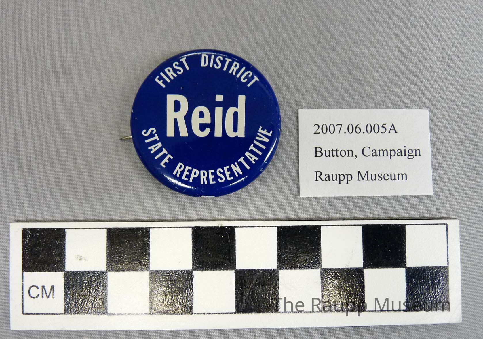 One (1) campaign button. The button is blue and white on the front, silver on the back. It has the text: "First District State Representative Reid". It has a pin on the back.
