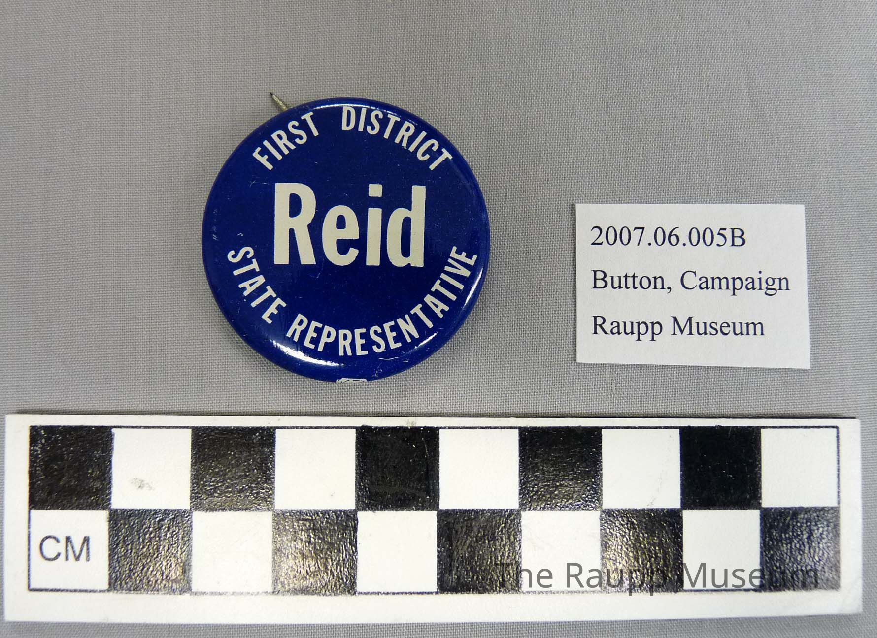 One (1) campaign button. The button is blue and white on the front, silver on the back. It has the text: "First District State Representative Reid". It has a pin on the back.