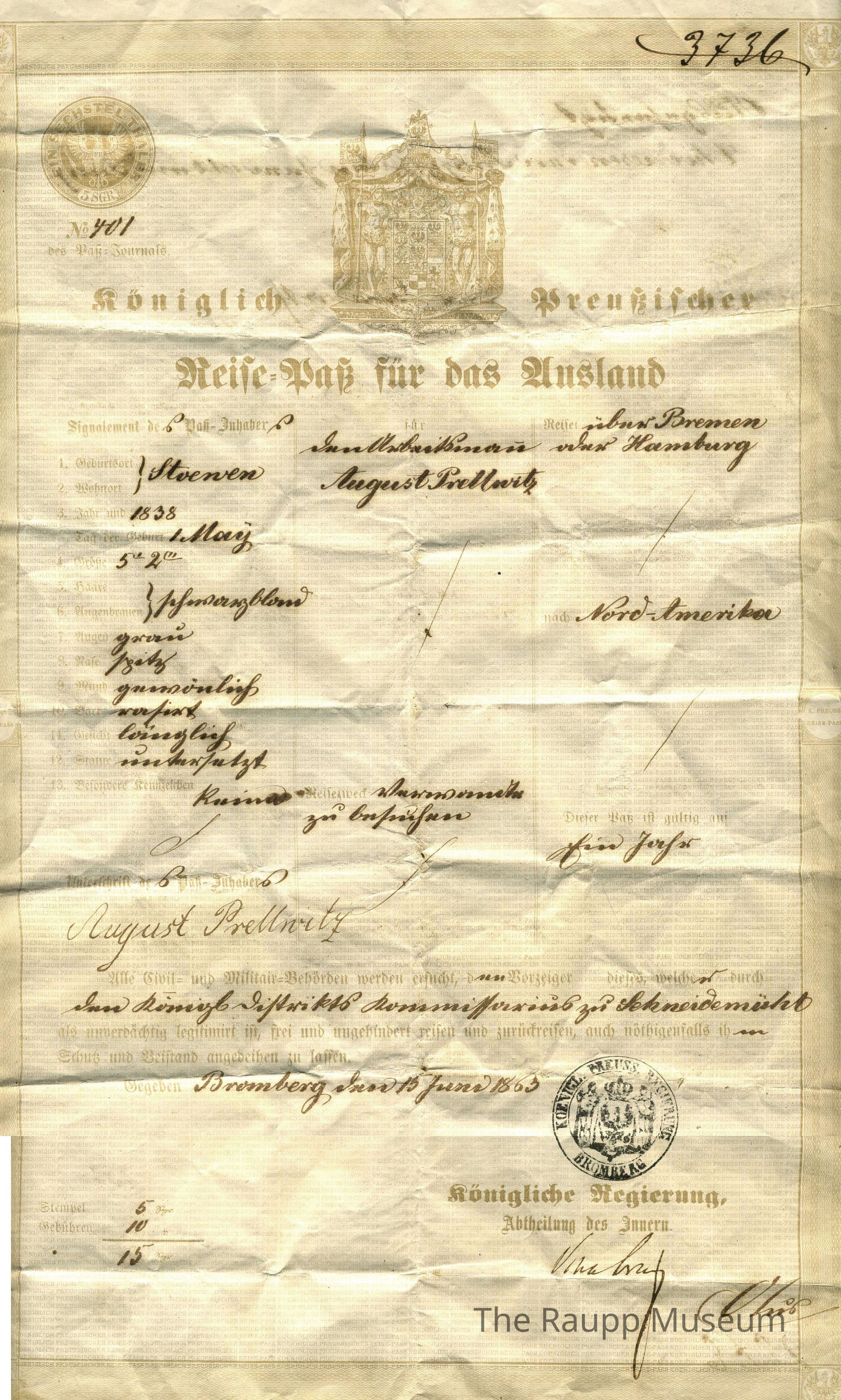 Official Prussian document granting August Prellwitz permission to leave Prussia to immigrate to the United States. Vertical bi-fold. Printed background text through out: "Koeniglich Preussischer reise-pass." Hand-numbered in ink at upper right corner: "3736" and also contains handwritten ink text regarding his residence, age, and destination. reverse has faded ink inscription and black stamped seal.Relationships