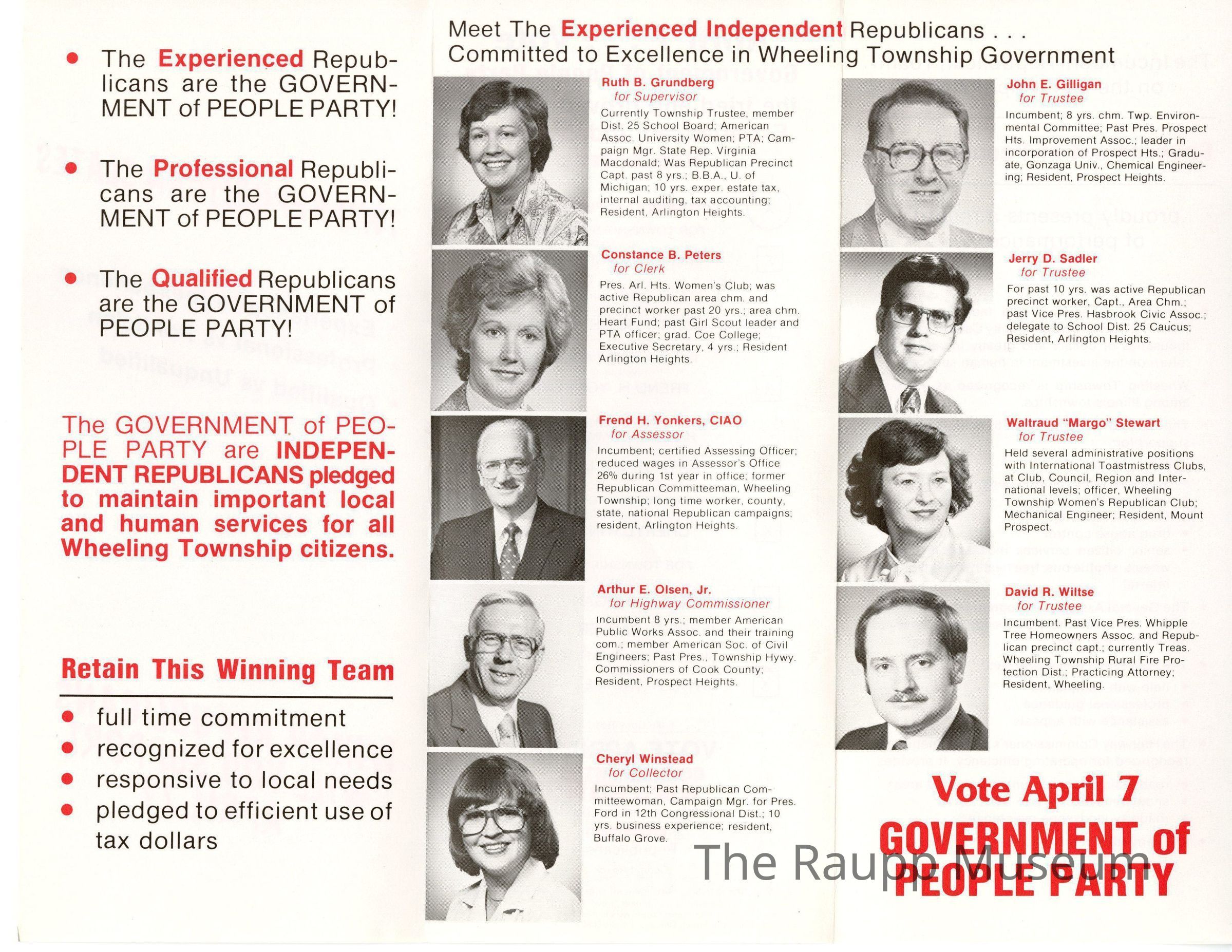 One (1) red and white pamphlet for Republicans "Government of People Party" for Wheeling Township elections, date unknown.