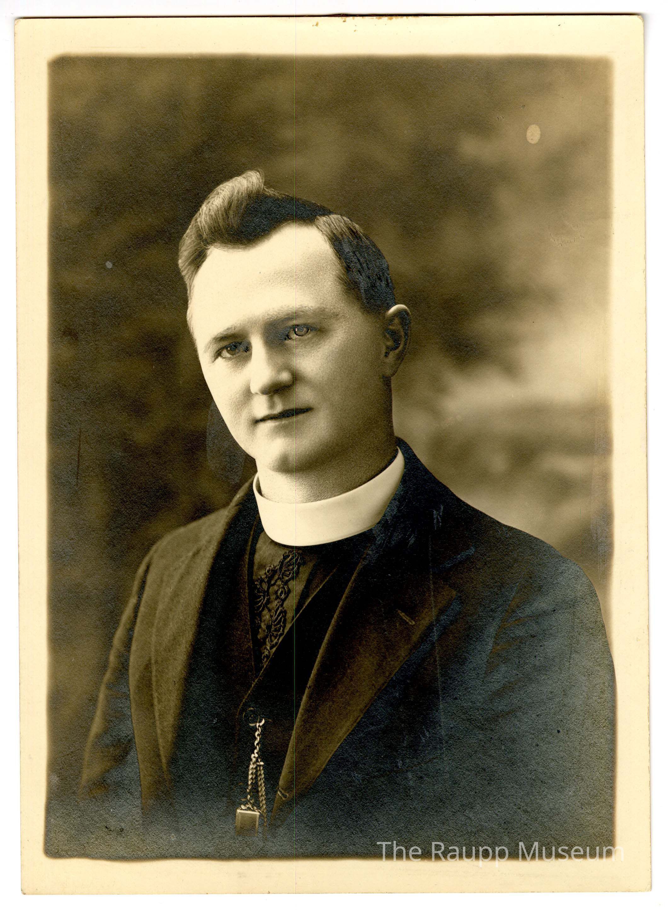 One (1) black and white portrait photograph of a Rev. Frank G. Mattes, from the waist up. He is wearing a dark suit and clerical attire, marked by the distinctive white collar. He has a metal chain hanging from his breast button on his vest, and there is decorative embroidery on his shirt behind the vest. The backdrop is softly blurred, with trees or bushes backdrop.Dimensions