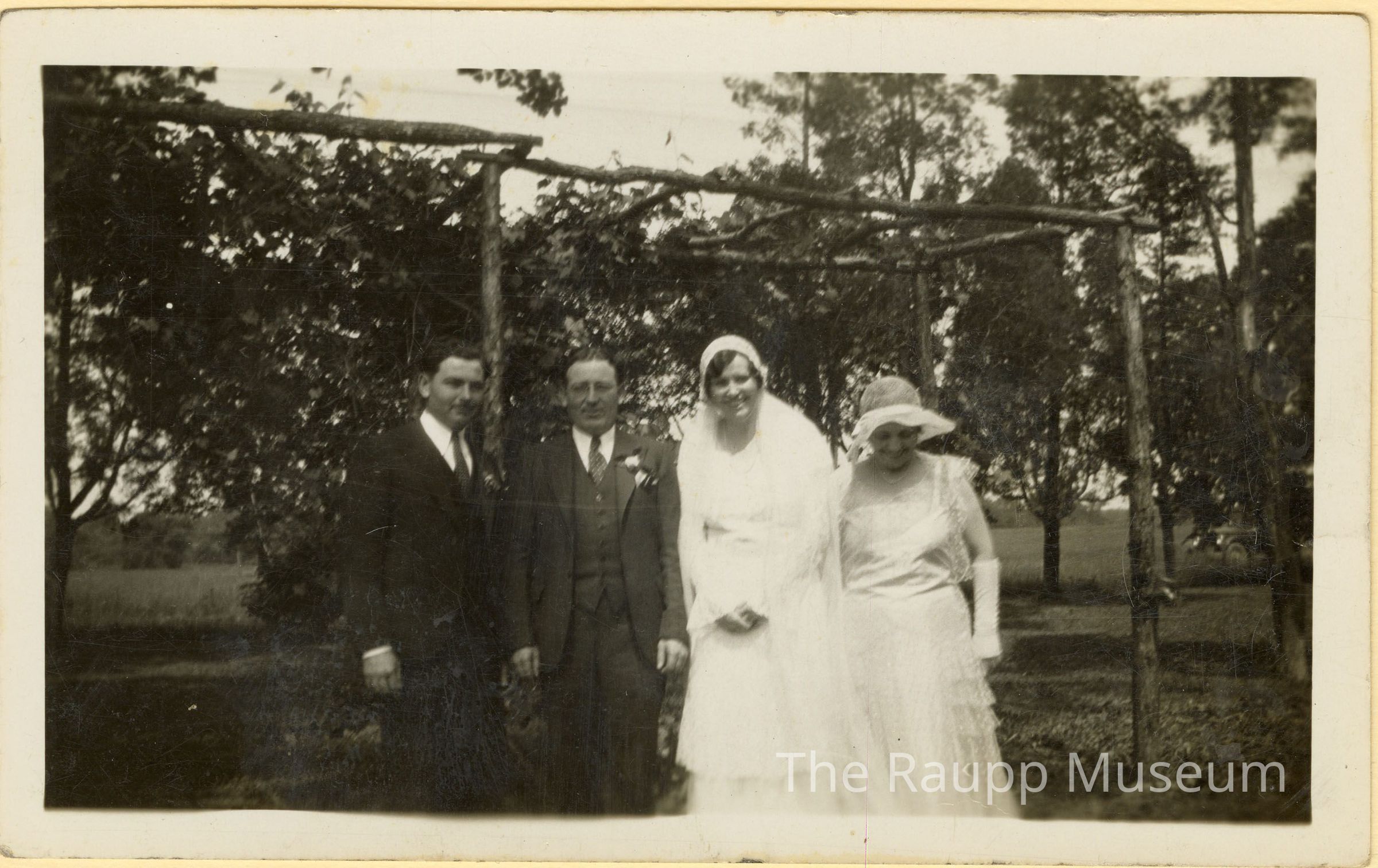 One (1) black and white photograph of Tess and Rheinhold Weidner on their wedding, outside, with another man and women. Tess and Rheinhold are in the center, with the woman in white next to Tess, and man in black suit next to Rheinhold. They are under a wooden canopy thing, with fields behind them and a truck in the back right corner.
