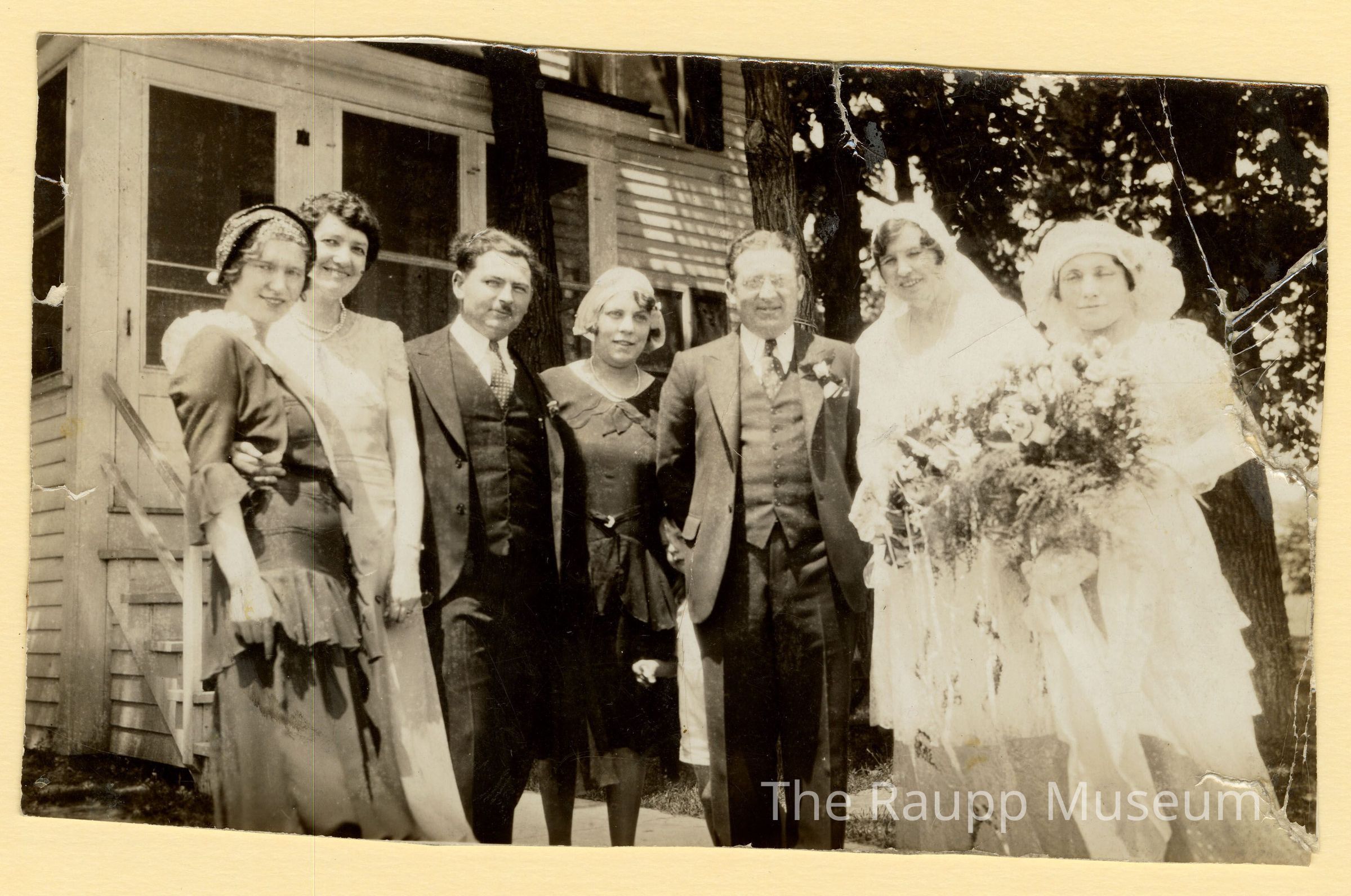 One (1) black and white photographic print of Rheinhold Weidner and Tess Dawson Wedding 1931, in Lake Forest, IL. Eight people (5 women, 2 men, one child) and standing in a semi-circle toward the camera, with a home and trees behind them. Pictured are: Peggy Dawson, Mary Vaughn, Bill, Helen, Rhymie, Tess and Florence Corcoran. The two women on the right are in wedding dresses with flowers. On the back of an identical photo is handwritten those pictured: Florence Corcoran, Tess Weidner, Rhynie Weidner, Helen Weidner, Bill Weidner, Mary Dawson Vaughn, ?.