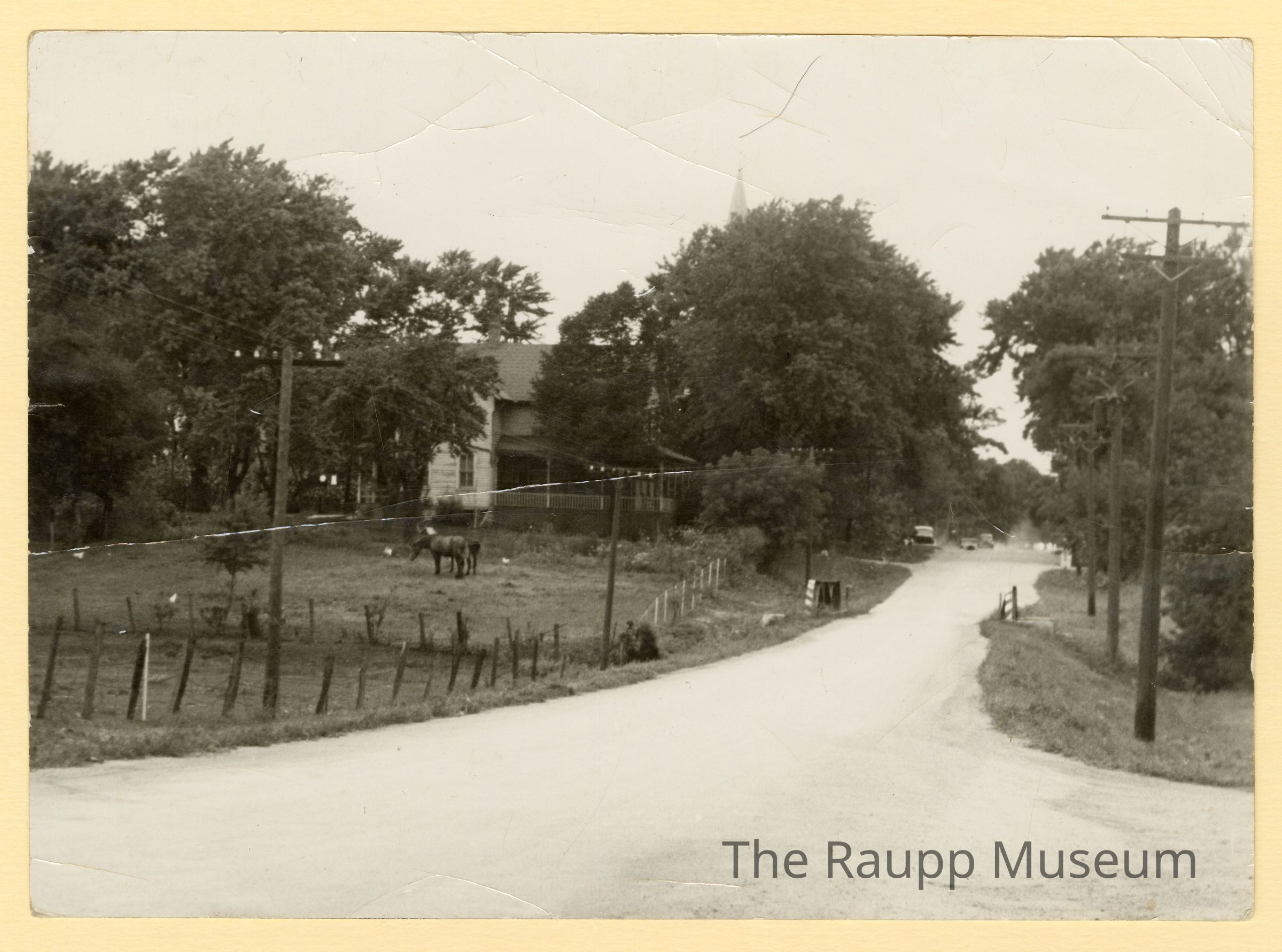 One (1) photographic print copy of the Weidner farmhouse located on Buffalo Grove and Lake Cook Road (before Lake Cook added). Photo is black and white, taken looking north on Buffalo Grove road. House is on the left, white two stories, with large trees surrounding much of house in front and back. Large tree on side obscures side. Two horses are in field next to house. There is a wood and metal link fence around yard. There are three cars visible down the street. St. Mary's steeple is visible in back behind tree. Right and left side on street have electricity poles.
