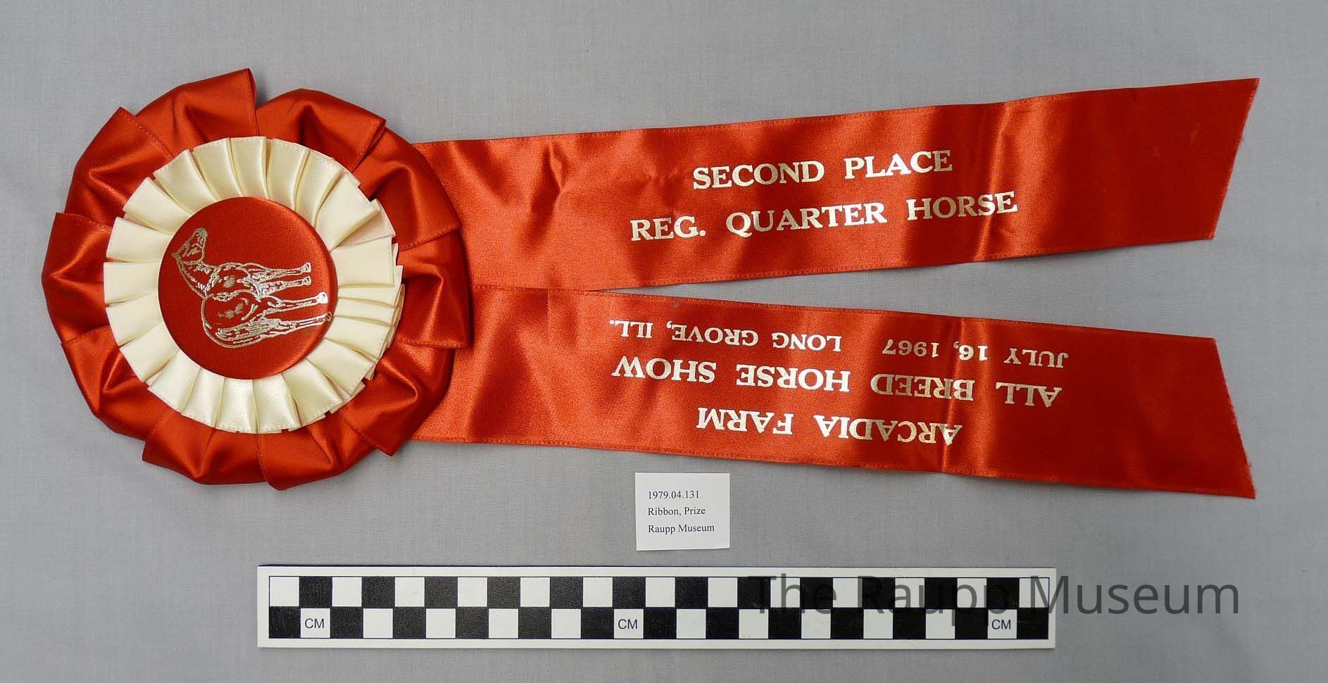 One (1) red, white, and gold satin prize ribbon. Circular two-color bow with hard center (with embossed horse) mounted onto a cardboard back, with metal loop for hanging. 2 red streamers hang down with embosing on them: on front "Arcadia Farm, All Breed Horse Show, July 16, 1967, Long Grove, ILL, Second Place, Reg. Quarter Horse," on back "Congratulations! Name: Sugar Foot; Date: July 16, 1967; Judge:; Class: Reg Quarter; Fargo Rubber Stamp Works, Inc.; PO Box 1366, 64 Fourth Street North, Fargo, North Dakota".Dimensions