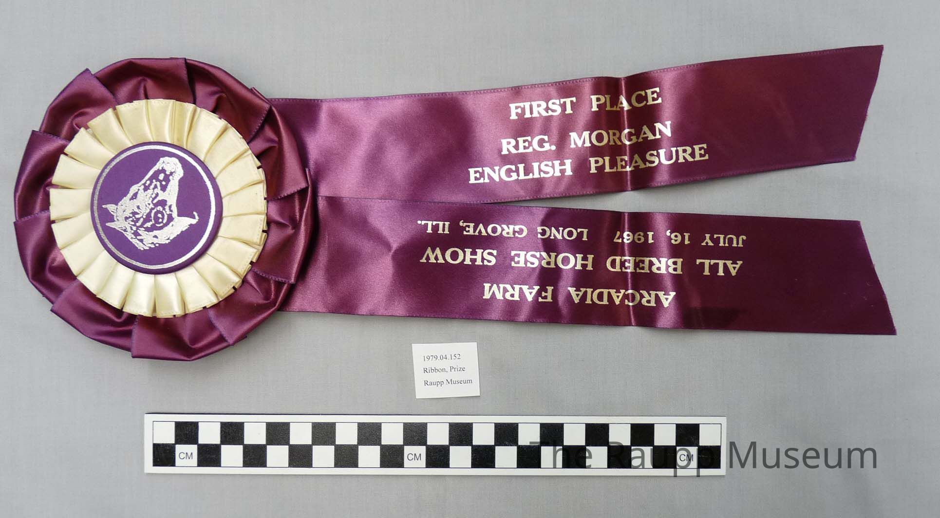 One (1) purple and white silken prize ribbon with metal button. Purple button with picture of horse. Button surrounded by a pleated white ribbon and a purple ribbon. Two purple ribbon tails descend from button. Silver writing on ribbon tails - right tail: "First Place Reg. Morgan English Pleasure"; left tail: "Arcadia Farm All Breed Horse Show, July 16, 1967, Long Grove, ILL."Condition