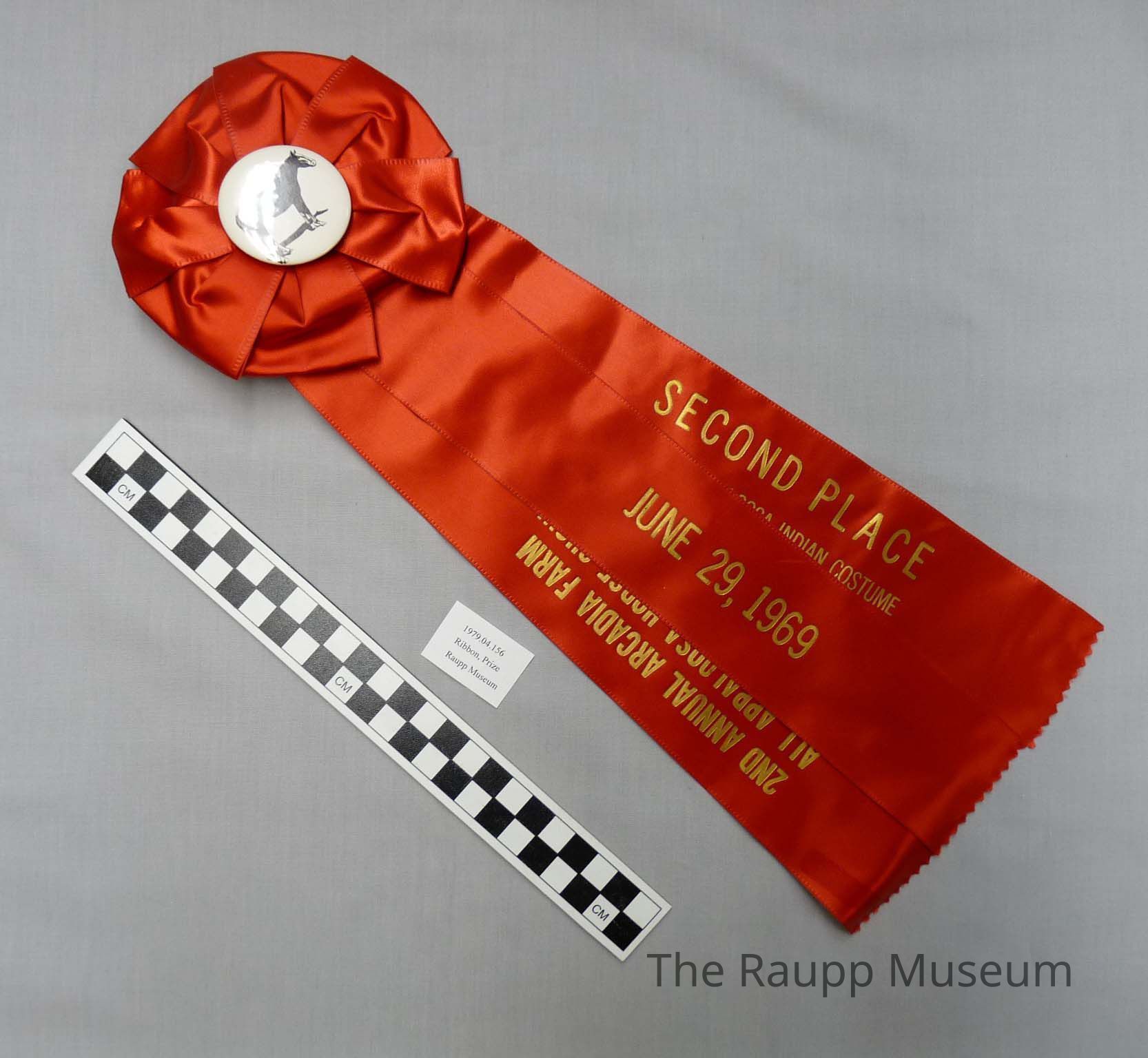 One (1) red, gold, white, and black satin ribbon with paper, plastic and metal components. Red ribbon has center rosette with button center. Button is white with black picture of appaloosa horse. Three streamers printed in gold, paper back with metal hanging hook. Left streamer reads: "2nd Annual Arcadia Farm All Appaloosa Horse Show". Center streamer: "June 29, 1969". Right streamer: "Second Place women - appaloosa Indian Costume". Paper back of ribbon has teal printing: "Congratulations, Event, Date, Regalia Mfg. Co., Rock Island, ILL".Dimensions