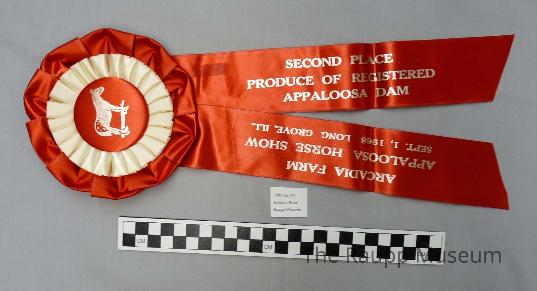 One (1) red and white silken prize ribbon with metal button. Red button with picture of horse. Button surrounded by pleated white ribbon and a red reibbon. Two red ribbon tails descending from button. Silver writing on ribbon tails. Right: "Second Place Produce of Registered Appaloosa Dam." Left: "Arcadia Farm Appaloosa Horse Show Sept. 1, 1968 Long Grove, ILL".Dimensions