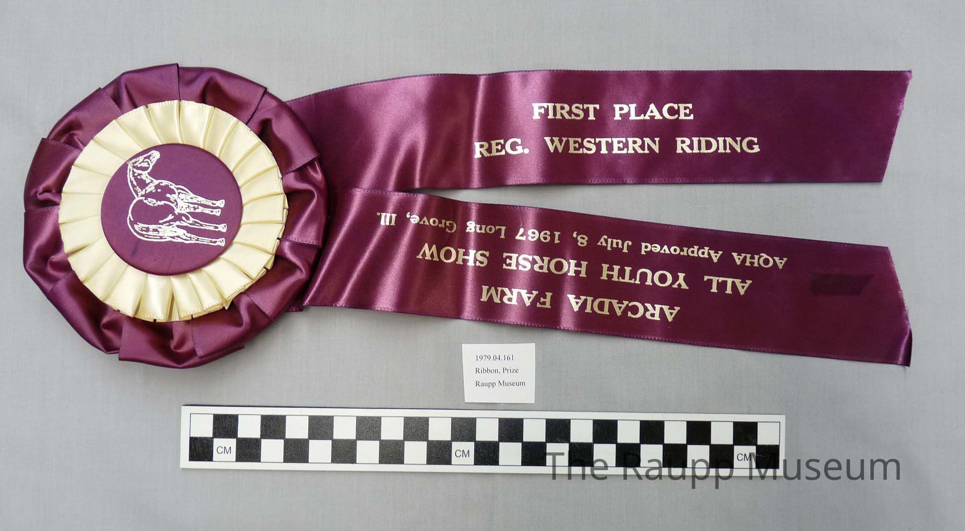 One (1) purple and white silken prize ribbon with metal button. Purple button with picture of horse. Button is surrounded by a pleated white ribbon and a purple ribbon. Two purple ribbon tails descending from button. Silver writing on ribbon tails. Right tail: "First Place Reg. Western Riding." Left tail: " Aracadia Farm All Youth Horse Show AQHAA".Dimensions