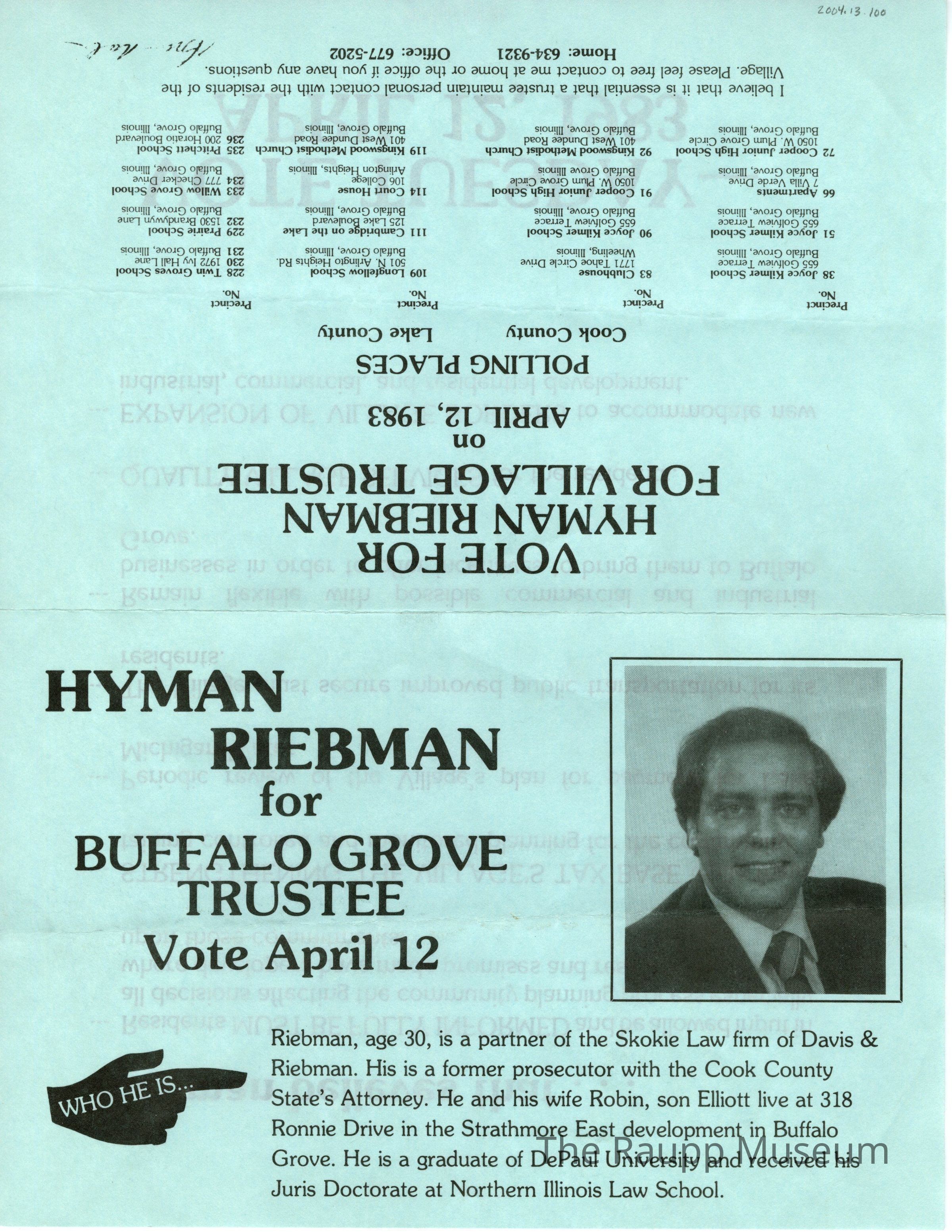 One (1) blue folded election pamphlet for Hyman Riebman for BG trustee. Has BG photo on front, and text on all sides.