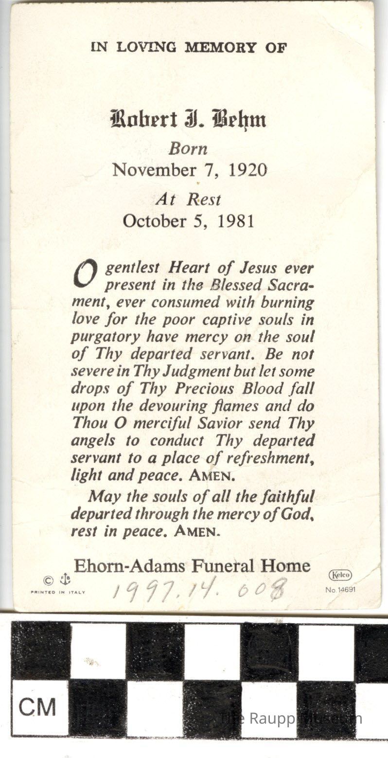 One (1) funeral prayer card for Robert J. Behm, born 11/07/1920 and died 10/05/1981. On one side is an obituary and prayer in English. On the other side is a color picture of a cross above a candlestick with three flames and a green leaf below it. A scripture passage in on the right.
