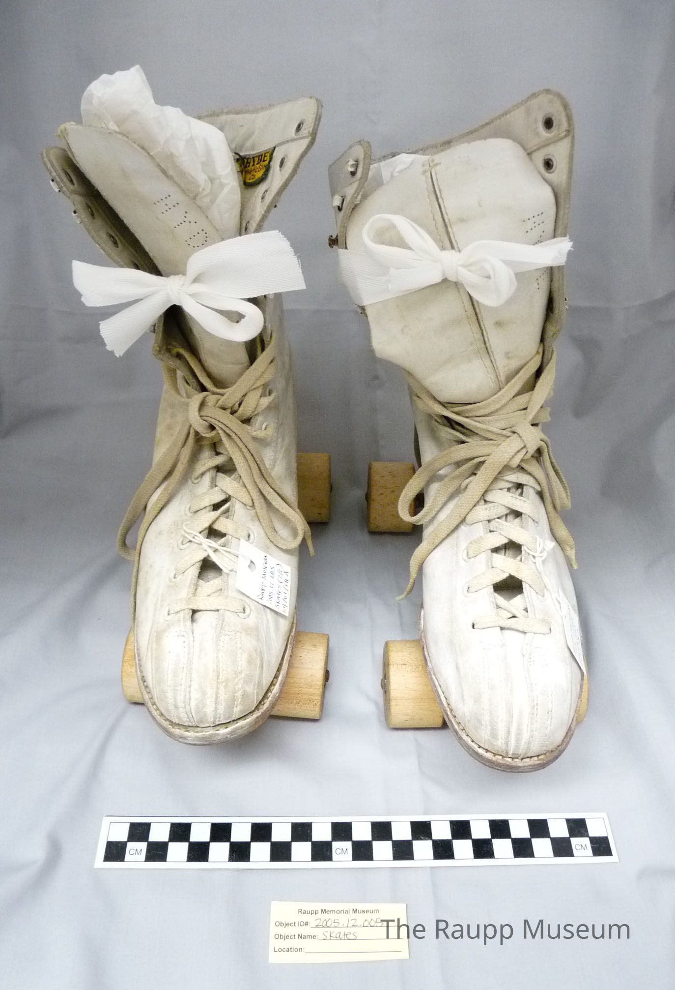 One (1) pair of roller skates - includes two skates (1/2 - left shoe and 2/2- right shoe). Both skates have four wooden rollers on the bottom with metal base. White leather shoes with a wooden brown heel and base are attached to the metal base. A white shoe tie goes from the bottom ad up the sides. The sides have metal latches to tighen the shoe ties around the ankle. The right side of the lip has "HYDE" punched into the leather as small hole design. The sides of the wooden rollers have "CHICAGO No. 87 sp Pat. No. 2-333-400" embossed on it. There is a white foam attachment to the inside of the tongue. On the inside of the top right shoe is a cloth yellow and green tag: "HYDE Althletic Shoe Co."Dimensions