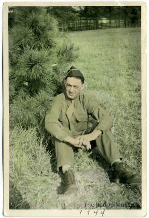 Hand-colored print with white border. Image of Roman Raupp wearing military uniform: a green shirt and tie with garrison cap. He is sitting in grass next to a pine tree. Hand dated "1944" on front lower edge. reverse side has processing stamp "9541."Relationships