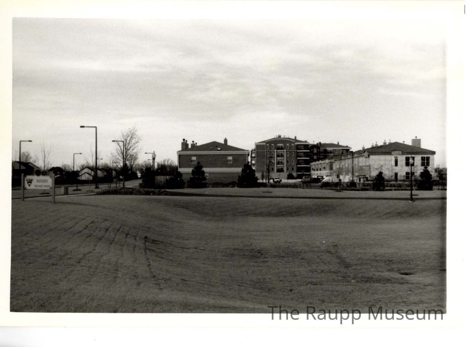 One (1) black and white photo of Rotary Village Green taken looking down the street with sign on left. Multi-story housing on the right. Grass in front.Made/Created