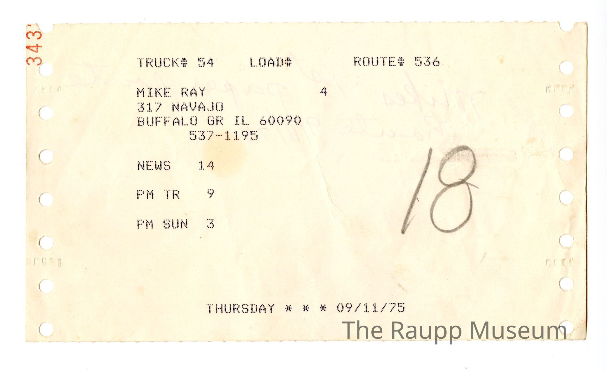 One (1) route slip for newspaper delivery route for Mike Ray on September 11, 1975. Route slip has holes along the short edges, and route information printed on one side: "Truck 54, Load, Route 536, Mike Ray, 317 Navajo Buffalo GR IL 60090, 537-1195, News 14, Pm TR 9, PM SUN 3, Thursday *** 09/11/75". On the top left corner is red ink is printed "343". On the Front is also handwritten "18" and one the back is handwritten in red pen "Mikes 1st paper route Route 9/11/75".Dimensions