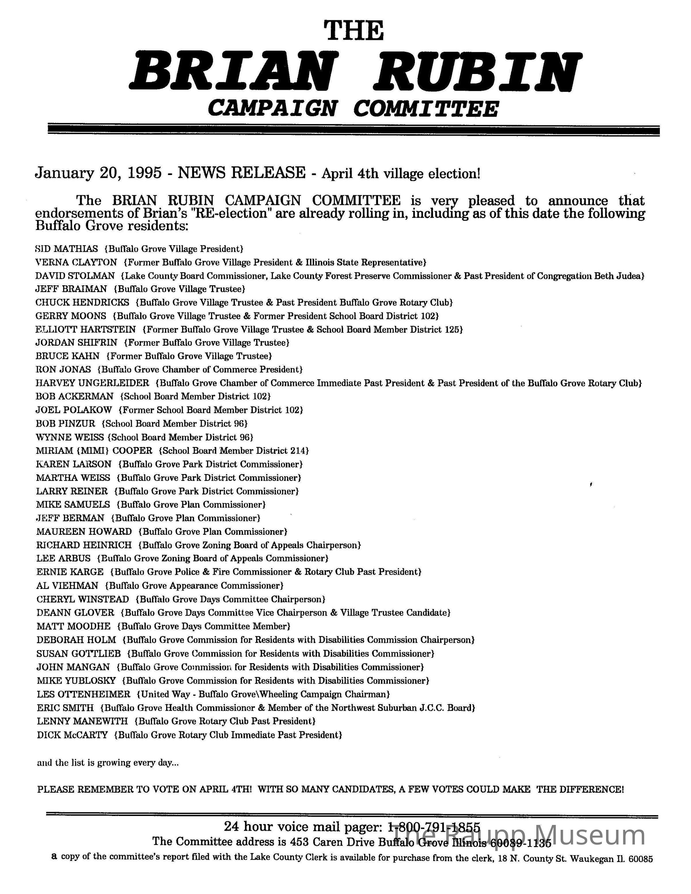 One (1) letter news release from the Brian Rubin committee with a list of all endoresements.