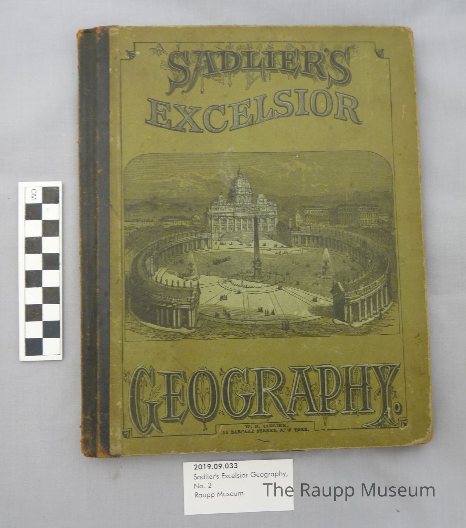 One (1) geography book titled "Sadlier's Excelsior Geography" by William H. Sadlier. It is hardcover with a green and black cover that has a decorative title and a hand drawn picture of the Vatican and St. Peters Bascilica in the center. There is a black leather spine. On the back is a ornate insignia for the author, with his initials. On page 29 is handwritten "Peter Weidner". There are handwritten answers to questions throughout the book in pencil.