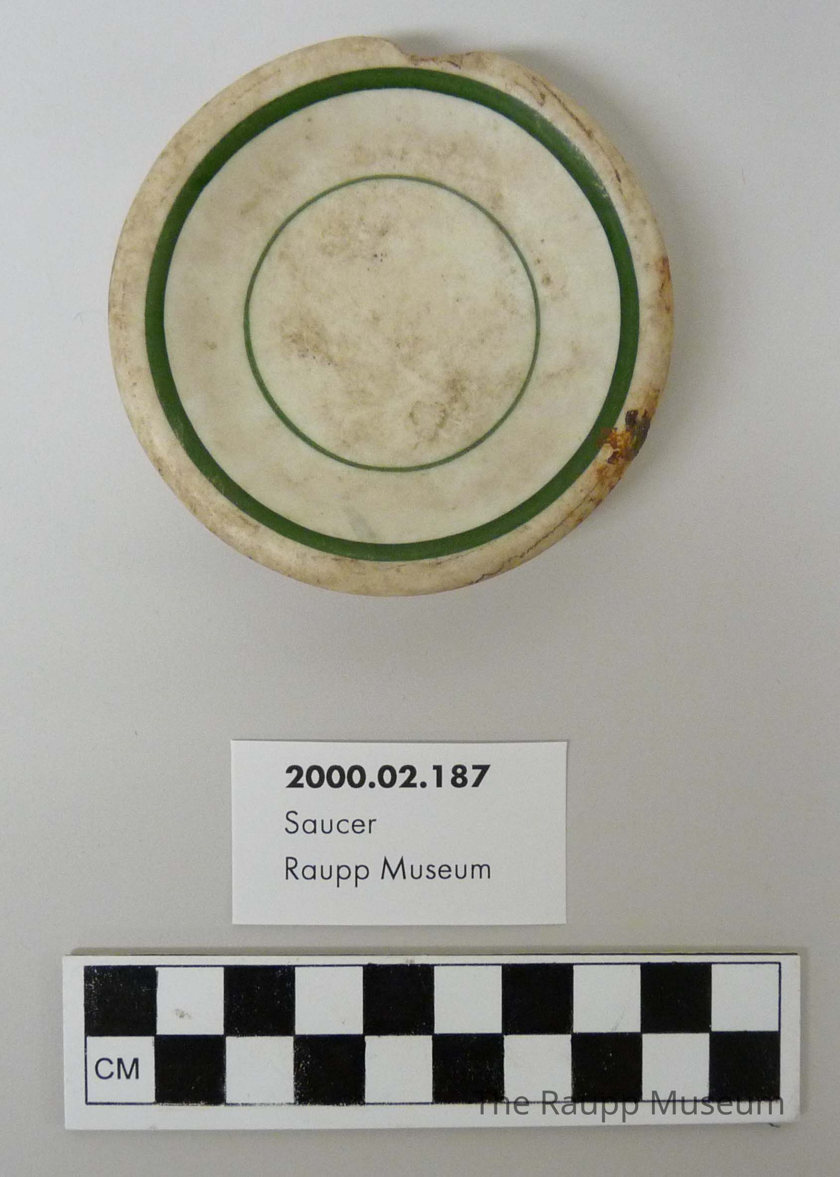 One (1) green and white small saucer (chip saucer). Made of white stoneware with green painted trim and another green circle on the bottom inside of dish. "Jackson Vitrified China" on bottom.