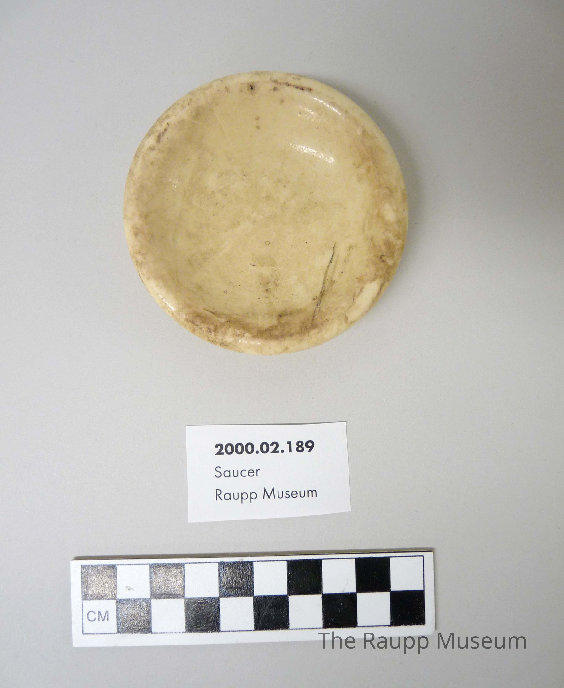 One (1) beige/white small china saucer with green substance stuck on the bottom (like a plastic covering).