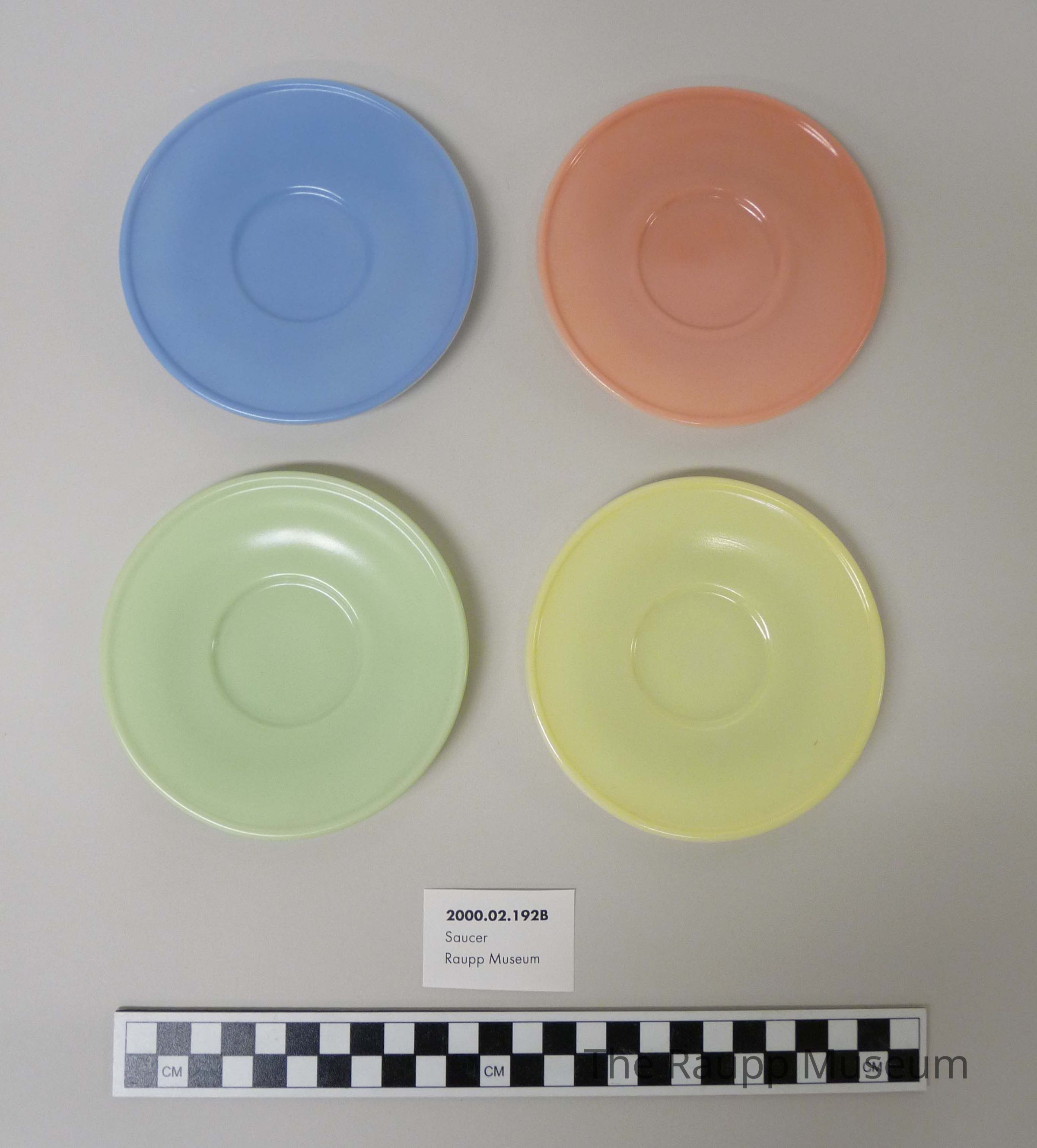 Four (4) glass saucers. Each saucer has a different color on top, including yellow, blue, green, and red. Part of a a set of dinnerware. The bottom of each saucer is white.