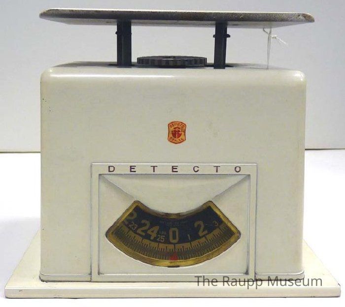 Metal platform produce scale. 25 pound dial measure in one ounce increments with fine adjustment knob. Painted white with red logo.