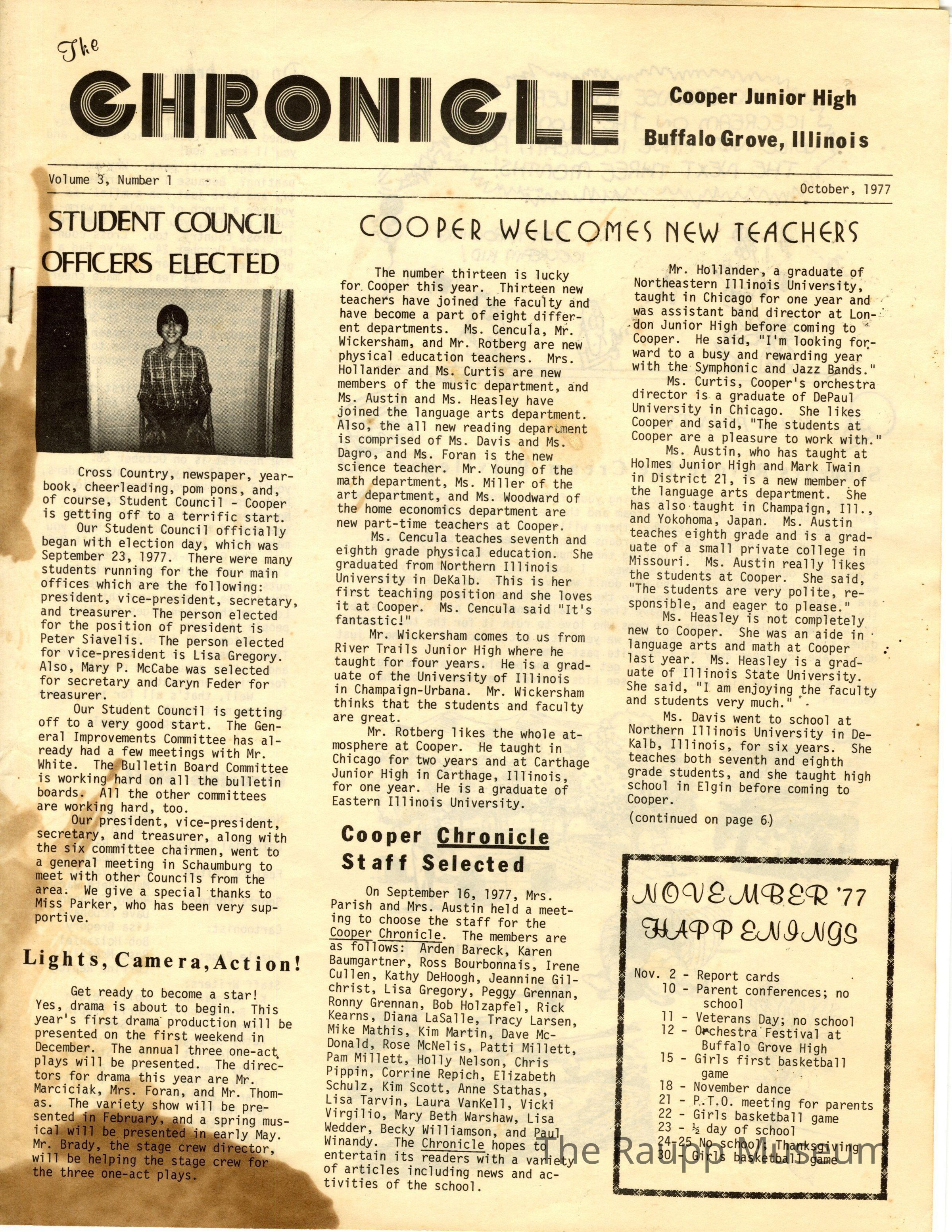 One (1) newspaper from Cooper Junior High, titled "The Chronicle" from October 1977. Paper is 5 pages, black and white with text and images. On the back is a drawing of a cobra with Cooper Cobra lettering. Contains articles about what is happening at the school and a puzzle in the center with pictures. There are also cartoons and drawings throughout. Paper stapled near top left corner.Archive Items Details