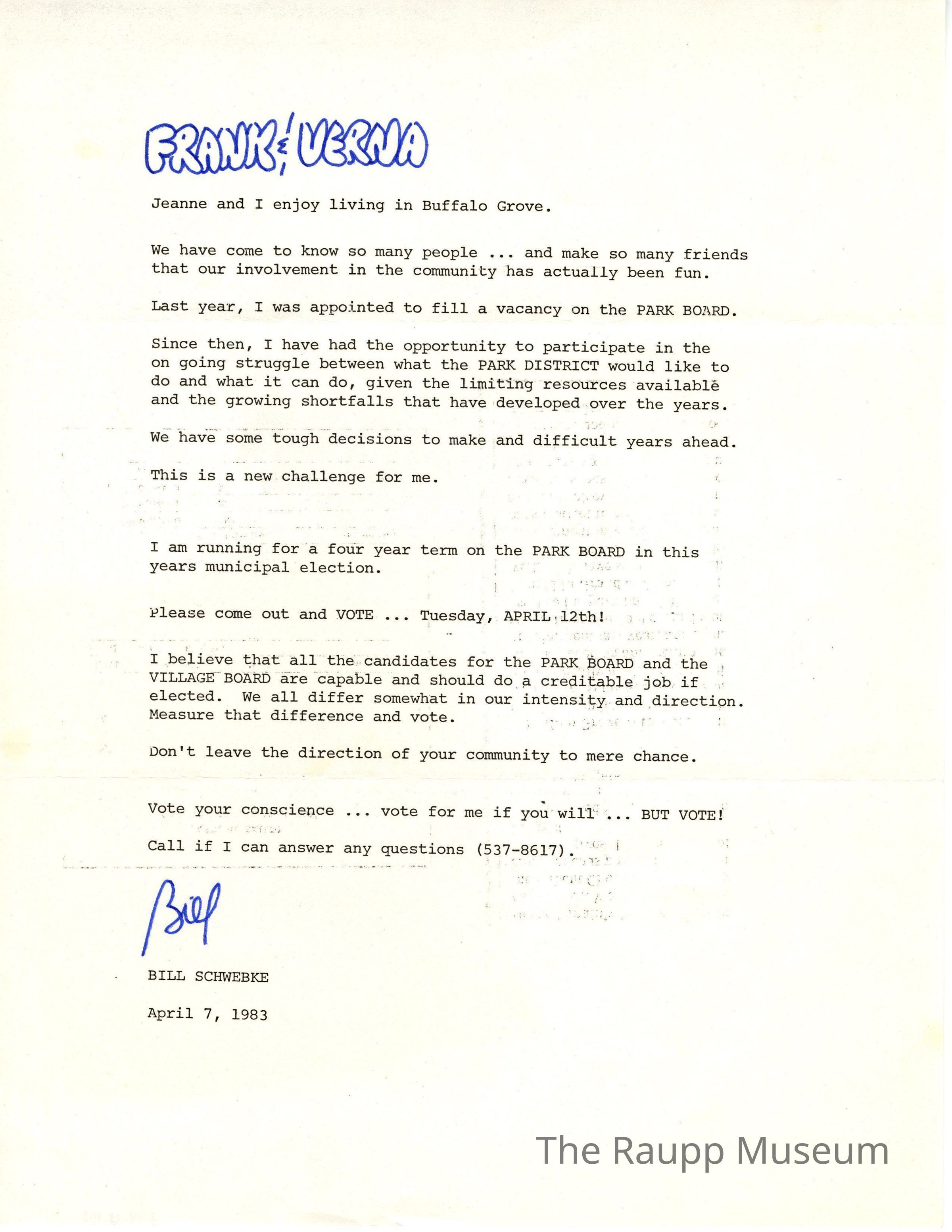 One (1) letter from Bill Schwebke, typed, to Frank and Verna Clayton about his campaign for Park Board and encouraging people to vote.
