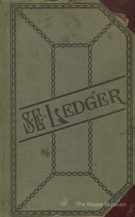 Hardbound ledger with green buckram covers and burgundy leather corners. Covers are stamped with black spiral chain pattern. Front cover stamped with "SE Ledger" marking across center. With 86 lined, numbered pages. Contains handwritten entries in black ink and pencil dated between 1934-1940. Page edges have alphabetical tabs from F-Z suggesting pages are missing. Contains personal and business financial records for the Dittrich farm.