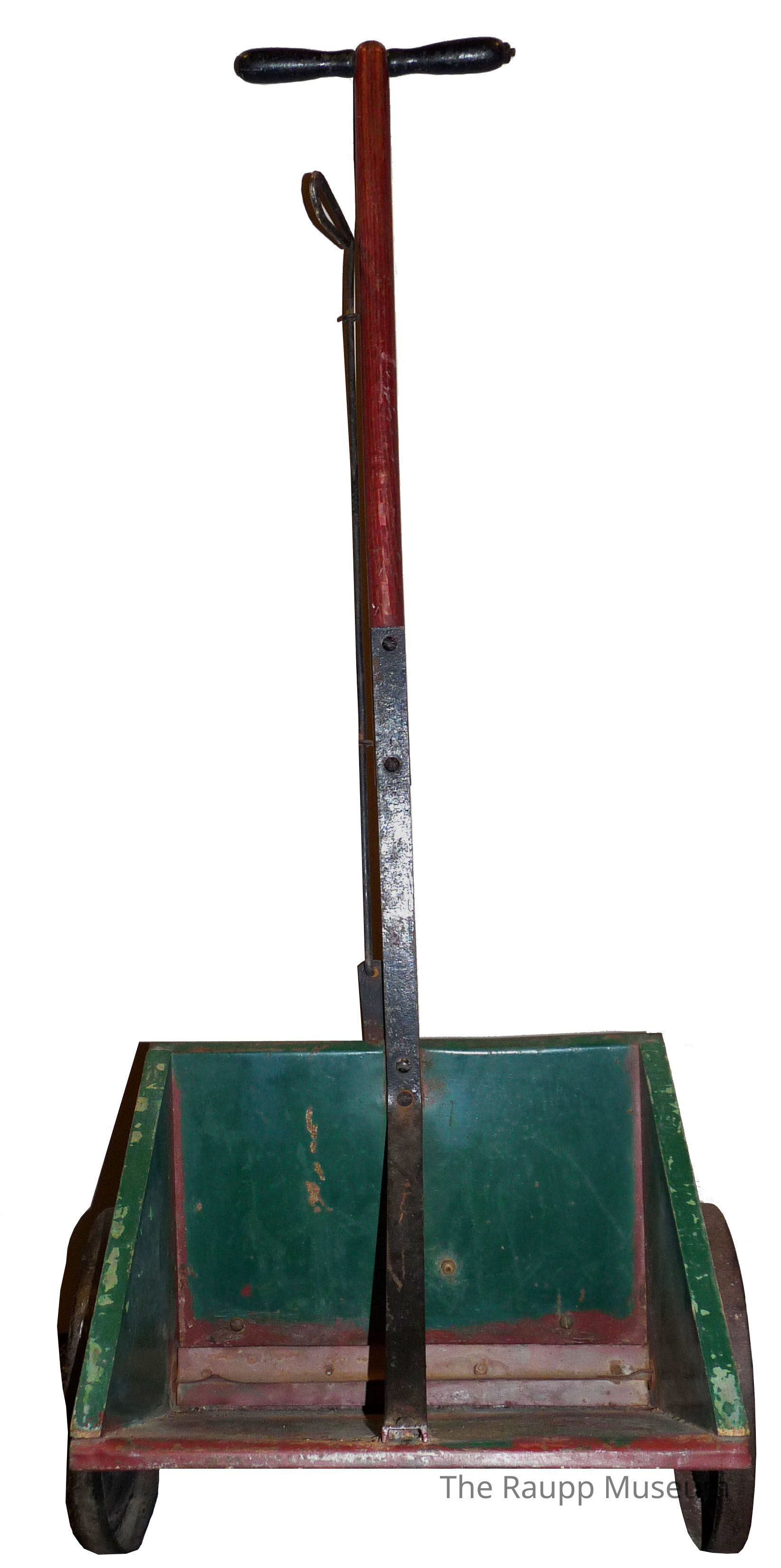 Wooden hand seed box seeder with two metal wheels. Metal and wood handle attached to the interior of the box's base. Rotating metal bar secured to the interior base used to distribute seeds. Box is three-sided, originally painted red and then covered with a layer of green.Dimensions