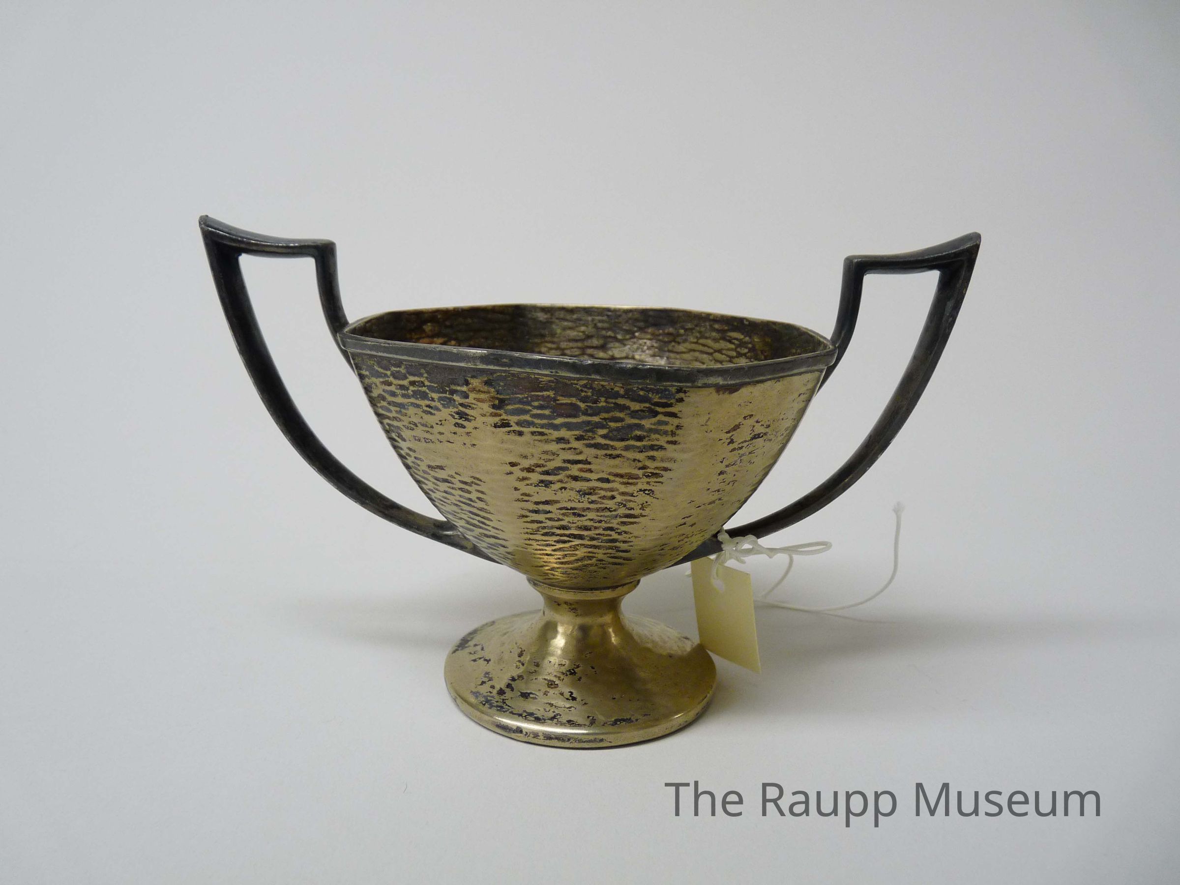 One (1) metal sugar dish, used as part of a set including a creamer, coffee pot, and tray (see Relations tab). Dish has a gold colored metal body with two black handles on opposite sides. Dish is rounded and is attached to a triangular/cone shaped base with a rounded bottom. There is a scale like embossed design on the ouside of the body and base. The bottom is stamped with: "Sheffield Design. Made in USA, 0623, E.P.N.S. W. M. M'T'S" and a picture of a lion, crown, and hand crests.Dimensions