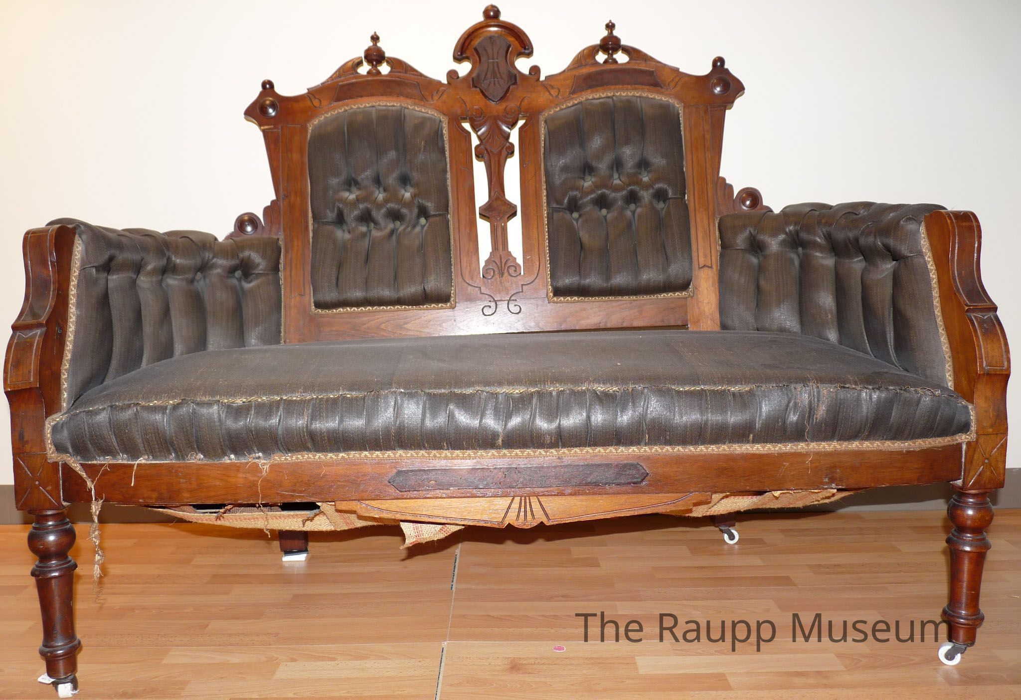 Gothic revival style settee. High carved back, seating for two. Open wood carving in center back. Dark brown taffeta type upholstery with button tufts and cording. Carved front legs and arms.Dimensions