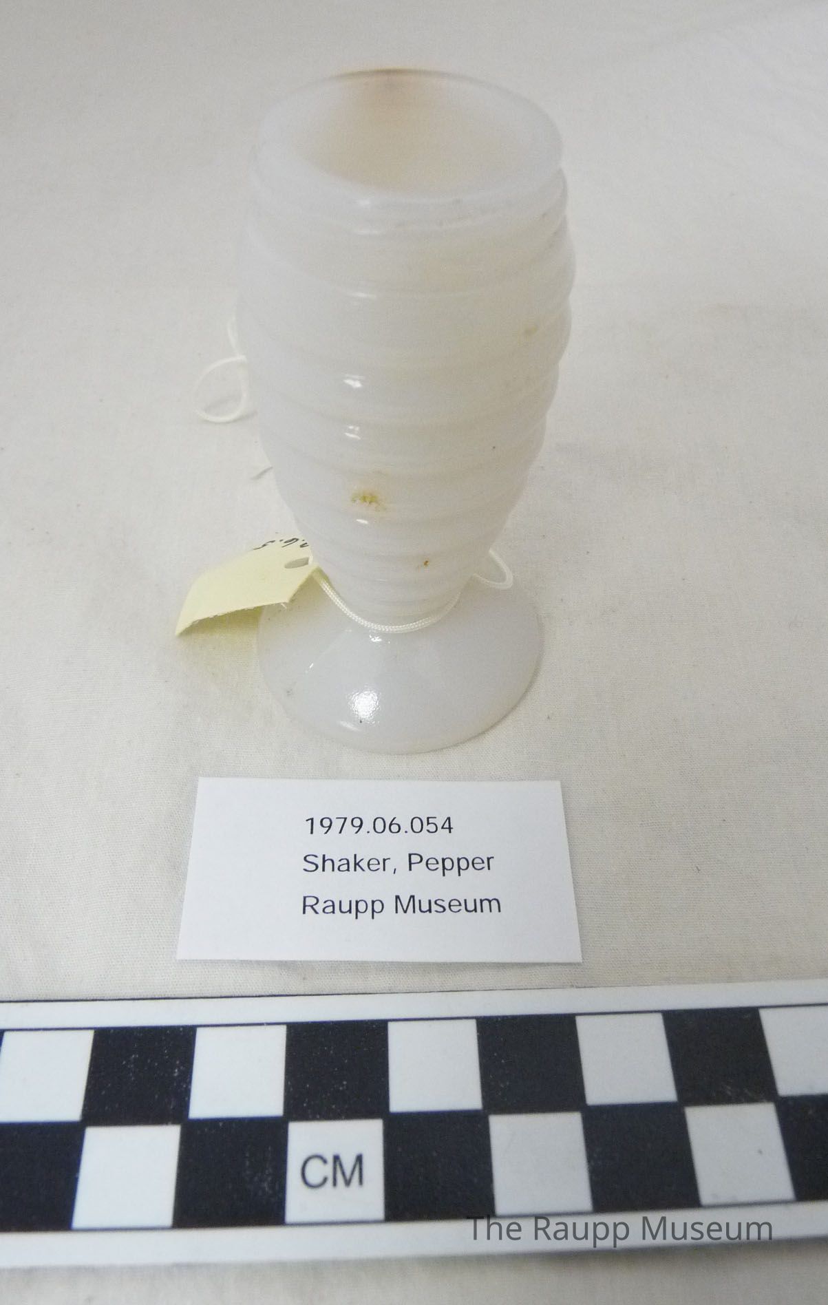 One (1) milk glass shaker (salt or pepper) with grooves on top for lid, but no lid present. Sides are shaped with embossed 1/4" rings of glass. Marks: "AH", for Anchor Hocking.Dimensions