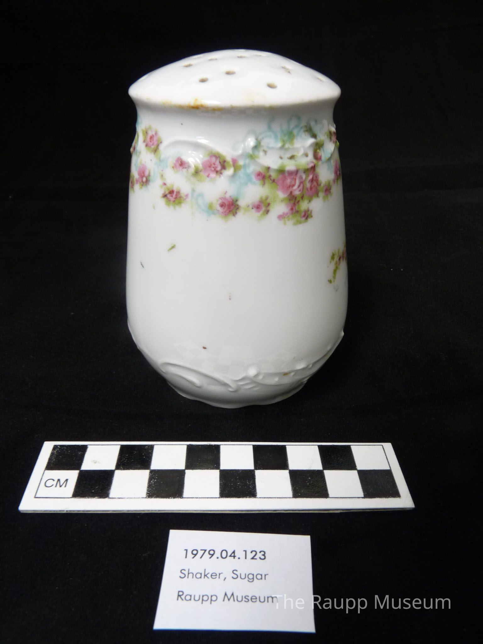 One (1) white, pink, green, and blue porcelain powdered sugar shaker. White china shaker is round, with 25 irregularly spaced holes at the top, a slightly wider base, and a hole in the bottom to fill the shaker. Cork is stuck inside shaker, rattling around. The shaker has a raised scroll pattern at top and bottom and is also painted with pink flower garlands twined with blue ribbon.Dimensions
