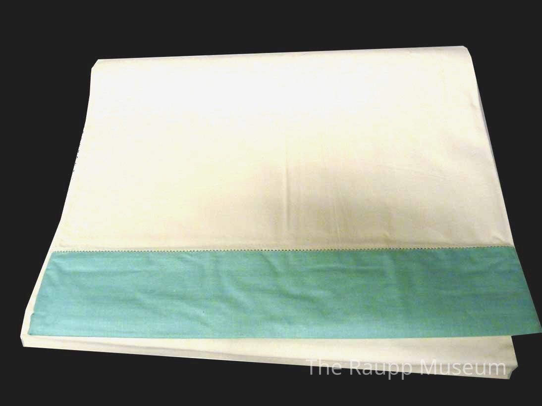Bedding flat sheet. White background with three-inch wide aqua hem and white hemstitch. Crisp overall with creases at folds.