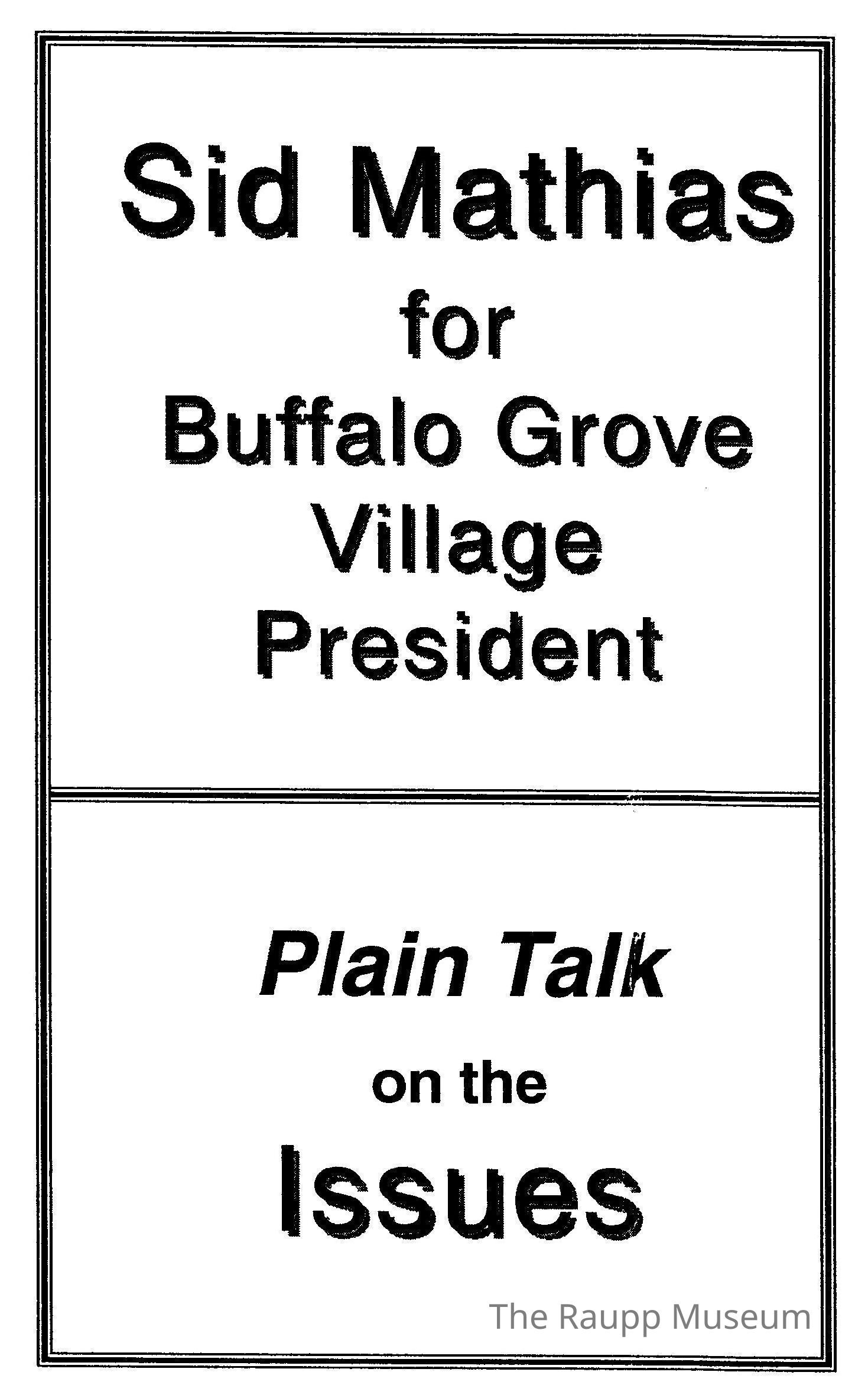 One (1) b/w election pamphlet for Sid Mathias, 4 pages. Contains stances on issues.