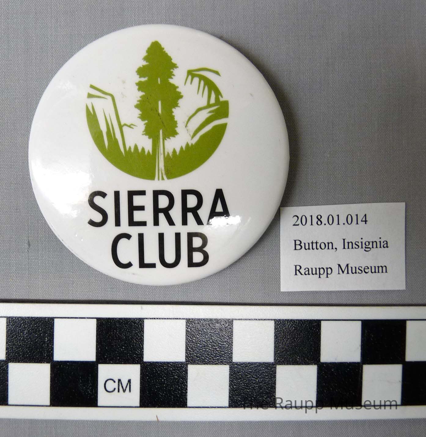 One (1) insignia button. The button has the text "Sierra Club" on one side, and silver with brown dots/scratches on the back side. There is a picture of a tree and mountains in green on the front. The button is white, green, and black. There is a safety pin affixed to the back.Condition